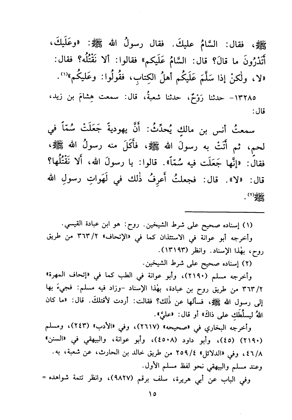 ١٣٢٨٥ - حَدَّثَنَا رَوْحٌ، حَدَّثَنَا شُعْبَةُ، قَالَ: سَمِعْتُ هِشَامَ بْنَ زَيْدٍ، قَالَ: سَمِعْتُ أَنَسَ بْنَ مَالِكٍ يُحَدِّثُ، أَنَّ يَهُودِيَّةً جَعَلَتْ سُمًّا فِي لَحْمٍ، ثُمَّ أَتَتْ بِهِ رَسُولَ اللهِ صَلَّى اللهُ عَلَيْهِ وَسَلَّمَ فَأَكَلَ مِنْهُ رَسُولُ اللهِ صَلَّى اللهُ عَلَيْهِ وَسَلَّمَ، فَقَالَ: " إِنَّهَا جَعَلَتْ فِيهِ سُمًّا " قَالُوا: يَا رَسُولَ اللهِ، أَلَا نَقْتُلُهَا؟ قَالَ: " لَا " قَالَ: فَجَعَلْتُ أَعْرِفُ ذَلِكَ فِي لَهَوَاتِ رَسُولِ اللهِ صَلَّى اللهُ عَلَيْهِ وَسَلَّمَ " (٢)