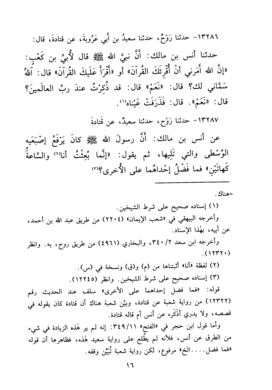 ١٣٢٨٦ - حَدَّثَنَا رَوْحٌ، حَدَّثَنَا سَعِيدُ بْنُ أَبِي عَرُوبَةَ، عَنْ قَتَادَةَ، قَالَ: حَدَّثَنَا أَنَسُ بْنُ مَالِكٍ، أَنَّ نَبِيَّ اللهِ صَلَّى اللهُ عَلَيْهِ وَسَلَّمَ قَالَ لِأُبَيِّ بْنِ كَعْبٍ: " إِنَّ اللهَ أَمَرَنِي أَنْ أُقْرِئَكَ الْقُرْآنَ أَوْ أَقْرَأَ عَلَيْكَ الْقُرْآنَ " قَالَ: آللَّهُ سَمَّانِي لَكَ؟ قَالَ: " نَعَمْ " قَالَ: قَدْ ذُكِرْتُ عِنْدَ رَبِّ الْعَالَمِينَ؟ قَالَ: " نَعَمْ " قَالَ: فَذَرَفَتْ عَيْنَاهُ (١)