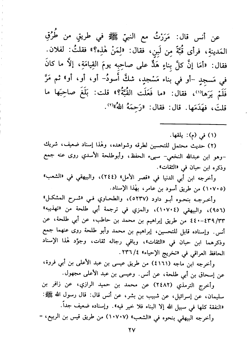 عَنْ أَنَسٍ قَالَ: مَرَرْتُ مَعَ النَّبِيِّ صَلَّى اللهُ عَلَيْهِ وَسَلَّمَ فِي طَرِيقٍ مِنْ طُرُقِ الْمَدِينَةِ، فَرَأَى قُبَّةً مِنْ لَبِنٍ، فَقَالَ: " لِمَنْ هَذِهِ؟ " فَقُلْتُ لِفُلَانٍ: فَقَالَ: " أَمَا إِنَّ كُلَّ بِنَاءٍ هَدٌّ عَلَى صَاحِبِهِ يَوْمَ الْقِيَامَةِ، إِلَّا مَا كَانَ فِي مَسْجِدٍ - أَوْ فِي بِنَاءِ مَسْجِدٍ، شَكَّ أَسْوَدُ - أَوْ، أَوْ، أَوْ " ثُمَّ مَرَّ فَلَمْ يَرَهَا، (١) فَقَالَ: " مَا فَعَلَتِ الْقُبَّةُ؟ " قُلْتُ: بَلَغَ صَاحِبَهَا مَا قُلْتَ: فَهَدَمَهَا. قَالَ: فَقَالَ: " رَحِمَهُ اللهُ " (٢)