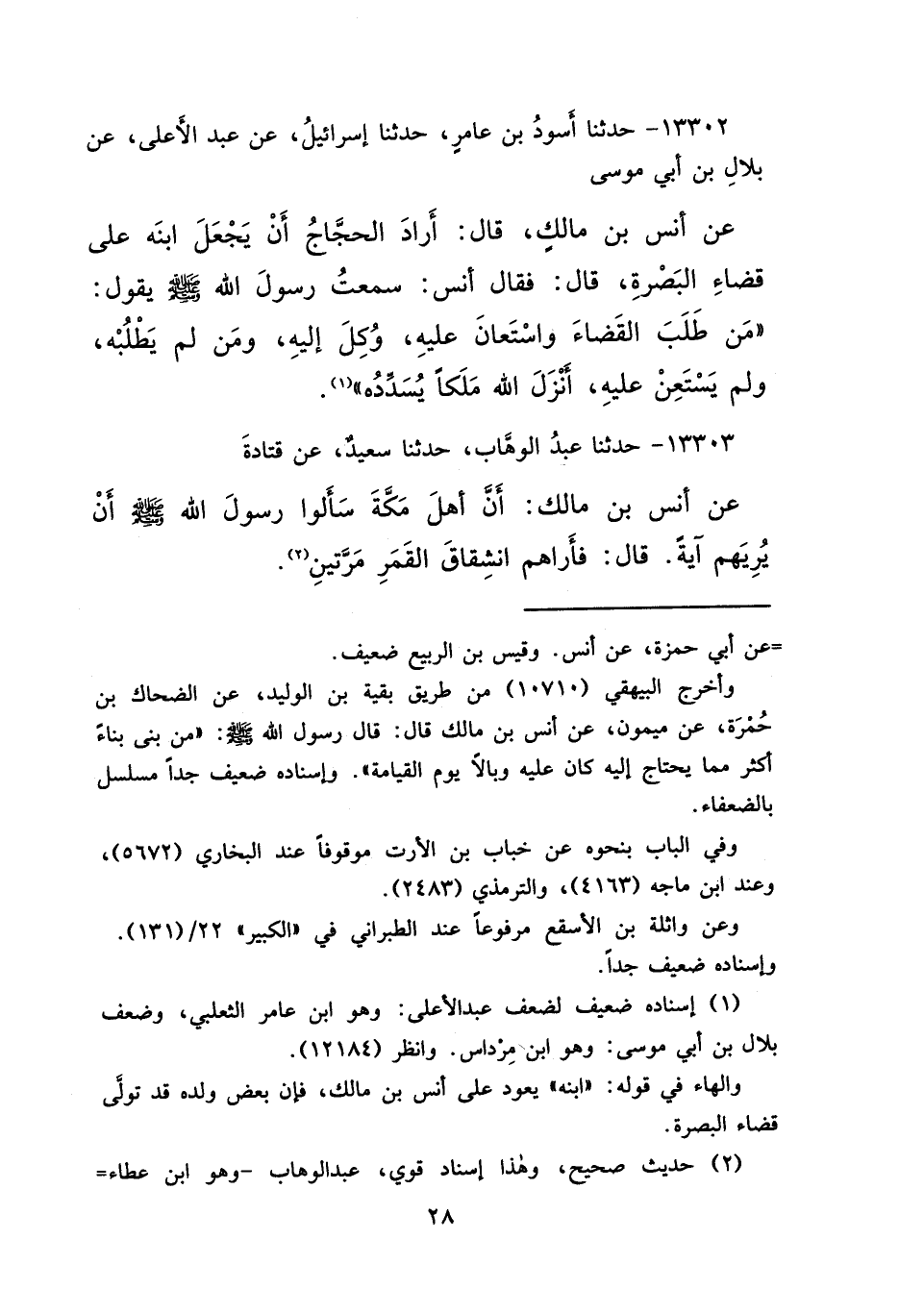 ١٣٣٠٢ - حَدَّثَنَا أَسْوَدُ بْنُ عَامِرٍ، حَدَّثَنَا إِسْرَائِيلُ، عَنْ عَبْدِ الْأَعْلَى، عَنْ بِلَالِ بْنِ أَبِي مُوسَى، عَنْ أَنَسِ بْنِ مَالِكٍ قَالَ: أَرَادَ الْحَجَّاجُ أَنْ يَجْعَلَ ابْنَهُ عَلَى قَضَاءِ الْبَصْرَةِ قَالَ: فَقَالَ أَنَسٌ: سَمِعْتُ رَسُولَ اللهِ صَلَّى اللهُ عَلَيْهِ وَسَلَّمَ يَقُولُ: " مَنْ طَلَبَ الْقَضَاءَ وَاسْتَعَانَ عَلَيْهِ، وُكِلَ إِلَيْهِ، وَمَنْ لَمْ يَطْلُبْهُ، وَلَمْ يَسْتَعِنْ عَلَيْهِ، أَنْزَلَ اللهُ مَلَكًا يُسَدِّدُهُ " (١)