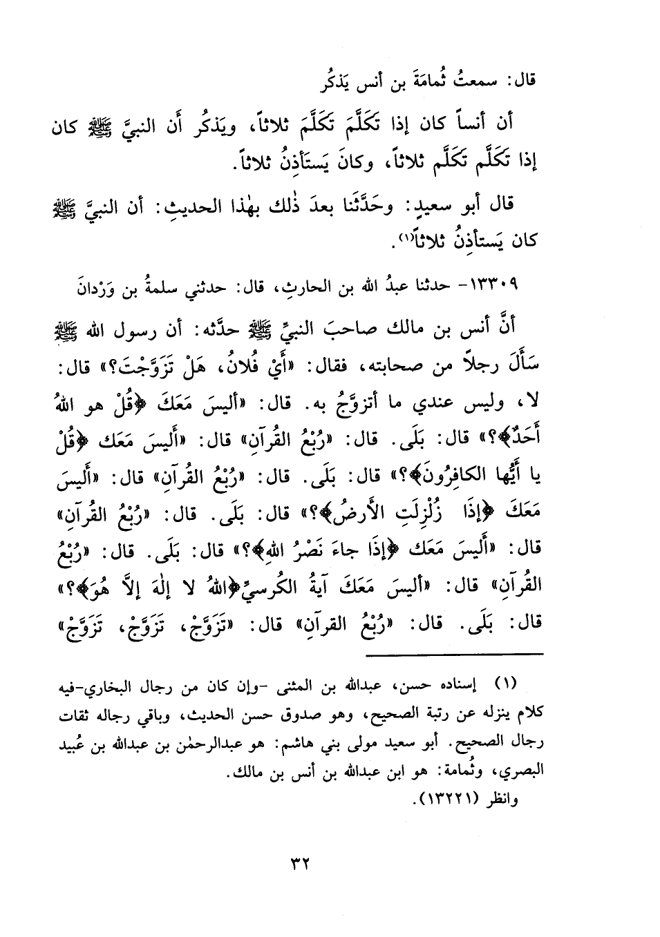 ١٣٣٠٩ - حَدَّثَنَا عَبْدُ اللهِ بْنُ الْحَارِثِ، قَالَ: حَدَّثَنِي سَلَمَةُ بْنُ وَرْدَانَ، أَنَّ أَنَسَ بْنَ مَالِكٍ، صَاحِبَ النَّبِيِّ صَلَّى اللهُ عَلَيْهِ وَسَلَّمَ حَدَّثَهُ، أَنَّ رَسُولَ اللهِ صَلَّى اللهُ عَلَيْهِ وَسَلَّمَ سَأَلَ رَجُلًا مِنْ صَحَابَتِهِ فَقَالَ: " أَيْ فُلَانُ، هَلْ تَزَوَّجْتَ؟ " قَالَ: لَا، وَلَيْسَ عِنْدِي مَا أَتَزَوَّجُ بِهِ، قَالَ: " أَلَيْسَ مَعَكَ قُلْ هُوَ اللهُ أَحَدٌ؟ " قَالَ: بَلَى، قَالَ: " رُبُعُ الْقُرْآنِ " قَالَ: " أَلَيْسَ مَعَكَ قُلْ يَا أَيُّهَا الْكَافِرُونَ؟ " قَالَ: بَلَى. قَالَ: " رُبُعُ الْقُرْآنِ ". قَالَ: " أَلَيْسَ مَعَكَ إِذَا زُلْزِلَتِ الْأَرْضُ؟ " قَالَ: بَلَى، قَالَ: " رُبُعُ الْقُرْآنِ ". قَالَ: " أَلَيْسَ مَعَكَ إِذَا جَاءَ نَصْرُ اللهِ؟ " قَالَ: بَلَى. قَالَ: " رُبُعُ الْقُرْآنِ ". قَالَ: " أَلَيْسَ مَعَكَ آيَةُ الْكُرْسِيِّ {اللهُ لَا إِلَهَ إِلَّا هُوَ} [البقرة: ٢٥٥] ؟ " قَالَ: بَلَى. قَالَ: " رُبُعُ الْقُرْآنِ " قَالَ: " تَزَوَّجْ، تَزَوَّجْ، تَزَوَّجْ "