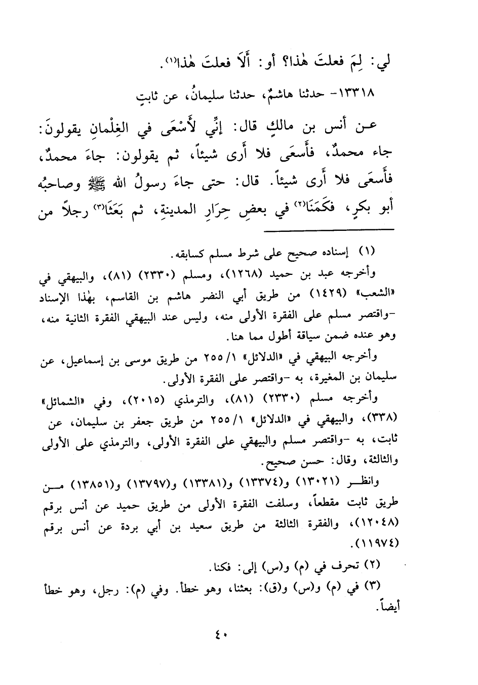 ١٣٣١٨ - حَدَّثَنَا هَاشِمٌ، حَدَّثَنَا سُلَيْمَانُ، عَنْ ثَابِتٍ، عَنْ أَنَسِ بْنِ مَالِكٍ قَالَ: إِنِّي لَأَسْعَى فِي الْغِلْمَانِ يَقُولُونَ: جَاءَ مُحَمَّدٌ، فَأَسْعَى فَلَا أَرَى شَيْئًا، ثُمَّ يَقُولُونَ: جَاءَ مُحَمَّدٌ، فَأَسْعَى فَلَا أَرَى شَيْئًا، قَالَ: حَتَّى جَاءَ رَسُولُ اللهِ صَلَّى اللهُ عَلَيْهِ وَسَلَّمَ، وَصَاحِبُهُ أَبُو بَكْرٍ، فَكَمَنَّا (٢) فِي بَعْضِ حِرَارِ الْمَدِينَةِ، ثُمَّ بَعَثَا (٣) رَجُلًا مِنْ