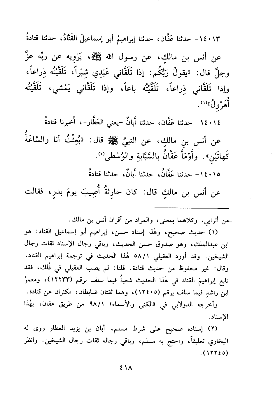 ١٤٠١٣ - حَدَّثَنَا عَفَّانُ، حَدَّثَنَا إِبْرَاهِيمُ أَبُو إِسْمَاعِيلَ الْقَنَّادُ، حَدَّثَنَا قَتَادَةُ، عَنْ أَنَسِ بْنِ مَالِكٍ، عَنْ رَسُولِ اللهِ صَلَّى اللهُ عَلَيْهِ وَسَلَّمَ، يَرْوِيهِ عَنْ رَبِّهِ عَزَّ وَجَلَّ قَالَ: " يَقُولُ: رَبُّكُمْ إِذَا تَلَقَّانِي عَبْدِي شِبْرًا، تَلَقَّيْتُهُ ذِرَاعًا، وَإِذَا تَلَقَّانِي ذِرَاعًا، تَلَقَّيْتُهُ بَاعًا، وَإِذَا تَلَقَّانِي يَمْشِي، تَلَقَّيْتُهُ أُهَرْوِلُ " (١)