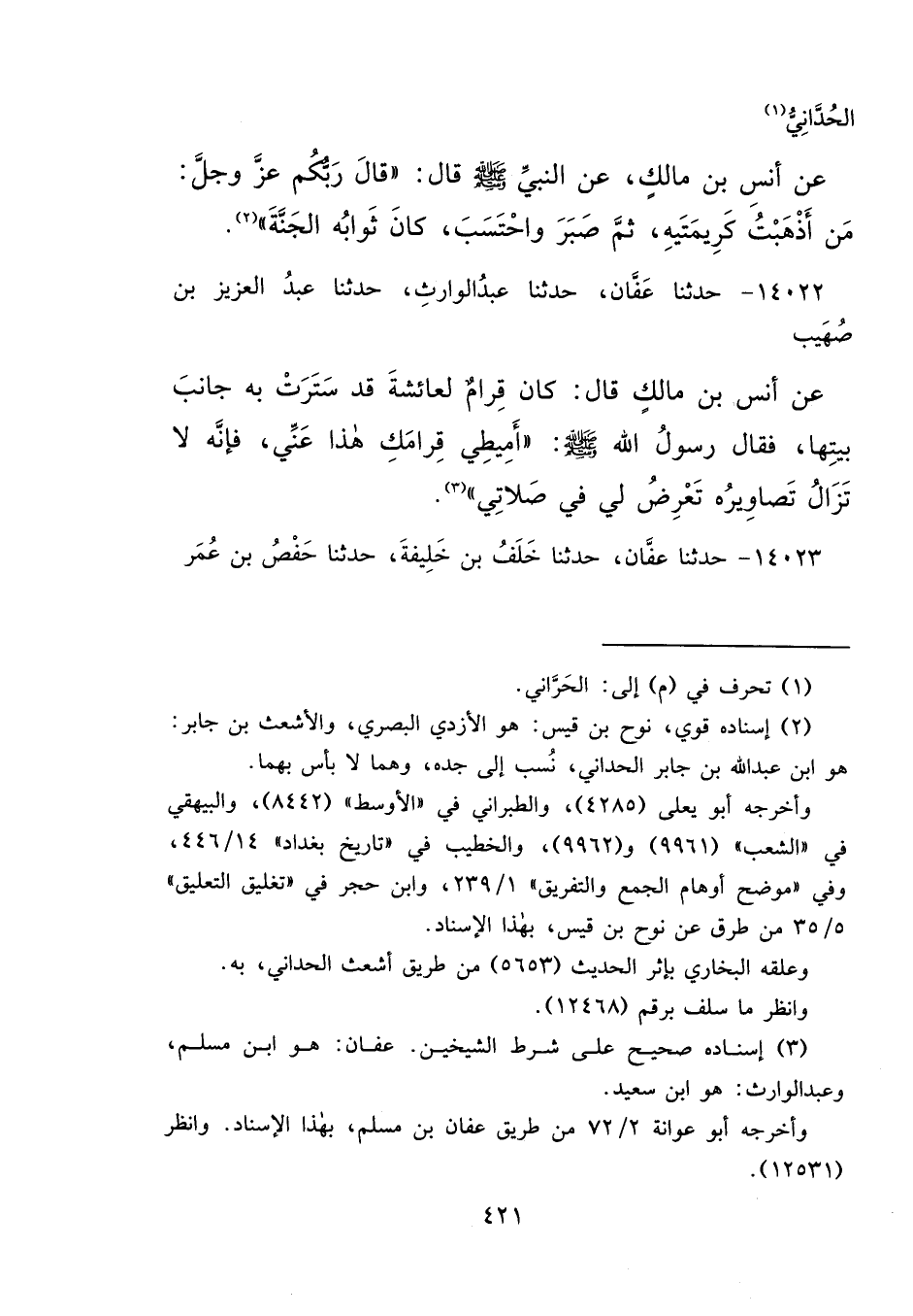 الْحُدَّانِيُّ، (١) عَنْ أَنَسِ بْنِ مَالِكٍ، عَنِ النَّبِيِّ صَلَّى اللهُ عَلَيْهِ وَسَلَّمَ قَالَ: " قَالَ رَبُّكُمْ عَزَّ وَجَلَّ: مَنْ أَذْهَبْتُ كَرِيمَتَيْهِ، ثُمَّ صَبَرَ وَاحْتَسَبَ، كَانَ ثَوَابُهُ الْجَنَّةَ " (٢)
