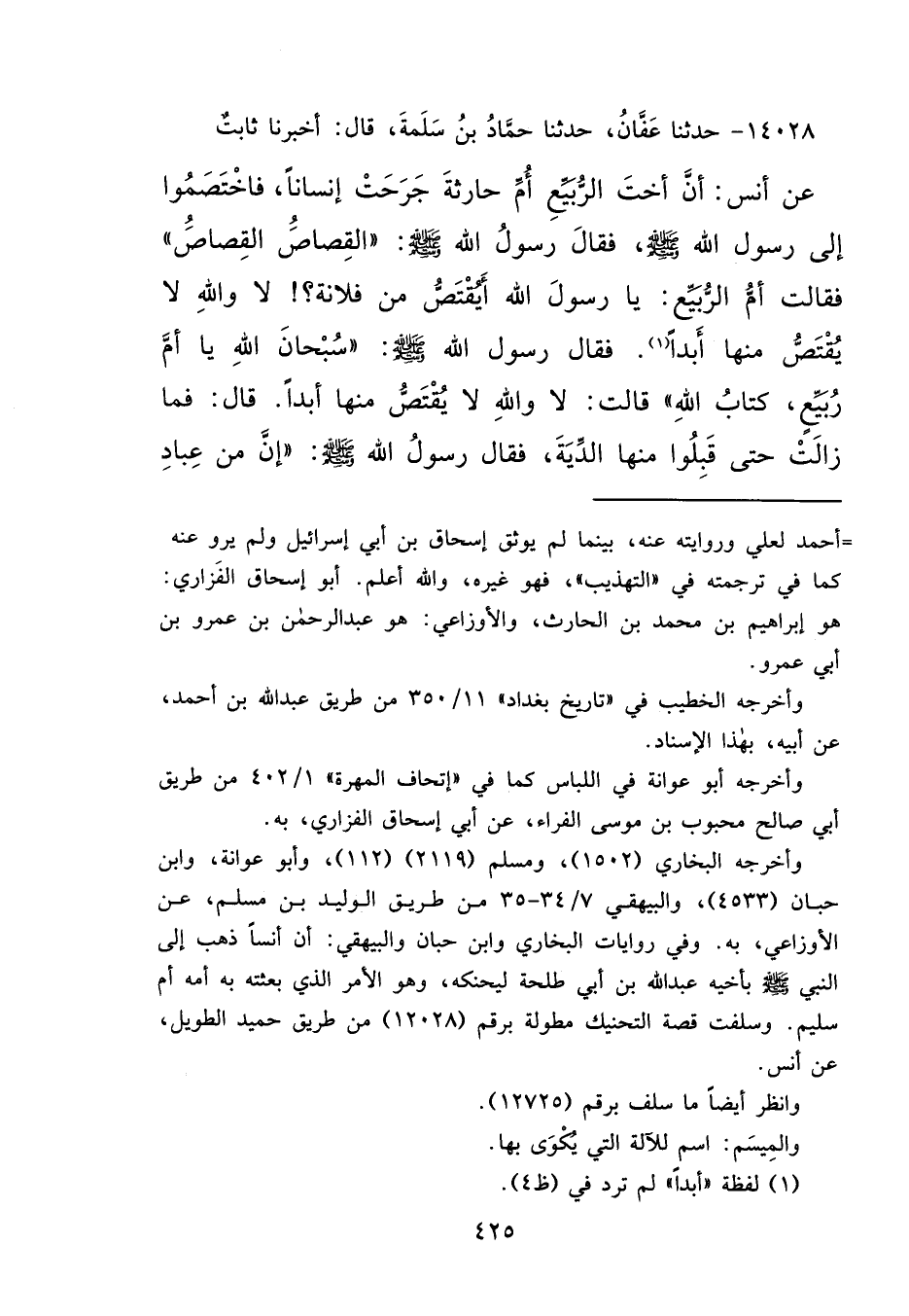 ١٤٠٢٨ - حَدَّثَنَا عَفَّانُ، حَدَّثَنَا حَمَّادُ بْنُ سَلَمَةَ، قَالَ: أَخْبَرَنَا ثَابِتٌ، عَنْ أَنَسٍ، أَنَّ أُخْتَ الرُّبَيِّعِ أُمَّ حَارِثَةَ، جَرَحَتْ إِنْسَانًا، فَاخْتَصَمُوا إِلَى رَسُولِ اللهِ صَلَّى اللهُ عَلَيْهِ وَسَلَّمَ، فَقَالَ رَسُولُ اللهِ صَلَّى اللهُ عَلَيْهِ وَسَلَّمَ: " الْقِصَاصُ، الْقِصَاصُ "، فَقَالَتْ أُمُّ الرُّبَيِّعِ: يَا رَسُولَ اللهِ، أَيُقْتَصُّ مِنْ فُلَانَةَ؟ لَا وَاللهِ لَا يُقْتَصُّ مِنْهَا أَبَدًا، فقَالَ رَسُولُ اللهِ صَلَّى اللهُ عَلَيْهِ وَسَلَّمَ: " سُبْحَانَ اللهِ يَا أُمَّ رُبَيِّعٍ، كِتَابُ اللهِ "، قَالَتْ: لَا وَاللهِ، لَا يُقْتَصُّ مِنْهَا أَبَدًا، (١) قَالَ: فَمَا زَالَتْ حَتَّى قَبِلُوا مِنْهَا الدِّيَةَ، فَقَالَ رَسُولُ اللهِ صَلَّى اللهُ عَلَيْهِ وَسَلَّمَ: " إِنَّ مِنْ عِبَادِ