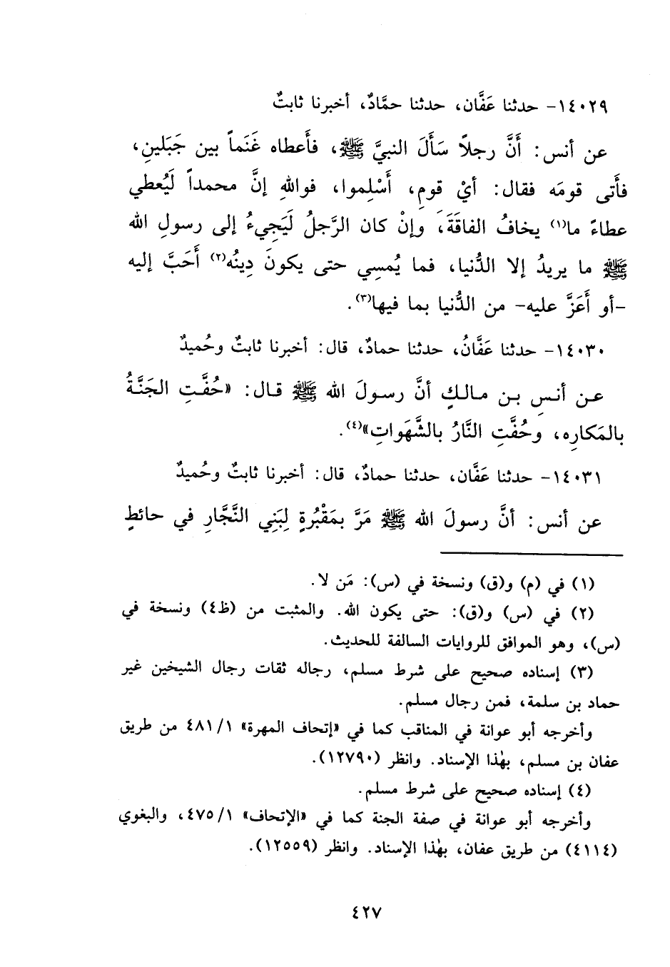 ١٤٠٣٠ - حَدَّثَنَا عَفَّانُ، حَدَّثَنَا حَمَّادٌ، قَالَ: أَخْبَرَنَا ثَابِتٌ، وَحُمَيْدٌ عَنْ أَنَسِ بْنِ مَالِكٍ، أَنَّ رَسُولَ اللهِ صَلَّى اللهُ عَلَيْهِ وَسَلَّمَ قَالَ: " حُفَّتِ الْجَنَّةُ بِالْمَكَارِهِ، وَحُفَّتِ النَّارُ بِالشَّهَوَاتِ " (٤)
