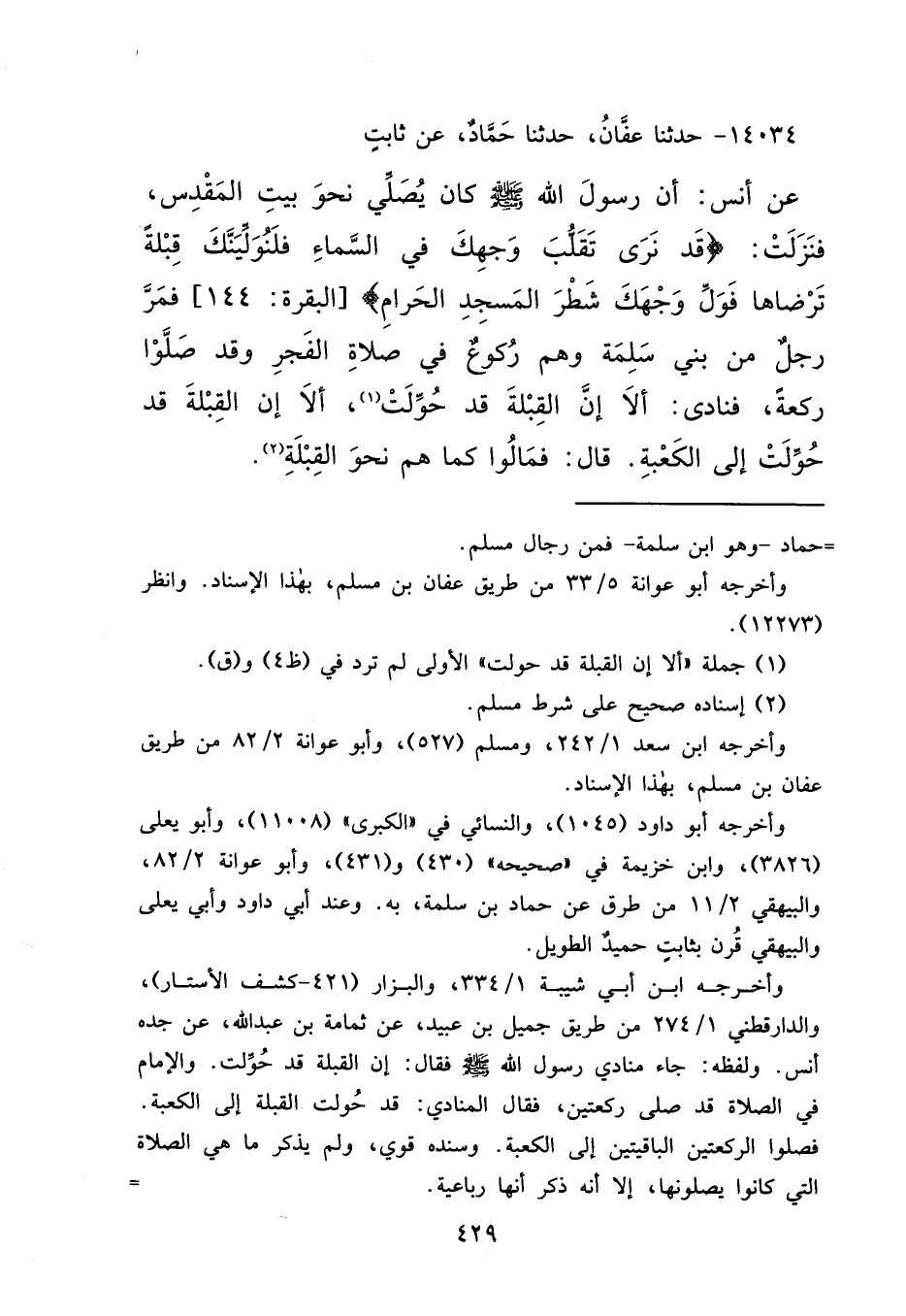 ١٤٠٣٤ - حَدَّثَنَا عَفَّانُ، حَدَّثَنَا حَمَّادٌ، عَنْ ثَابِتٍ، عَنْ أَنَسٍ، أَنَّ رَسُولَ اللهِ صَلَّى اللهُ عَلَيْهِ وَسَلَّمَ: " كَانَ يُصَلِّي نَحْوَ بَيْتِ الْمَقْدِسِ، فَنَزَلَتْ {قَدْ نَرَى تَقَلُّبَ وَجْهِكَ فِي السَّمَاءِ فَلَنُوَلِّيَنَّكَ قِبْلَةً تَرْضَاهَا فَوَلِّ وَجْهَكَ شَطْرَ الْمَسْجِدِ الْحَرَامِ} [البقرة: ١٤٤] "، فَمَرَّ رَجُلٌ مِنْ بَنِي سَلَمَةَ، وَهُمْ رُكُوعٌ فِي صَلَاةِ الْفَجْرِ، وَقَدْ صَلَّوْا رَكْعَةً، فَنَادَى: أَلَا إِنَّ الْقِبْلَةَ قَدْ حُوِّلَتْ، (١) أَلَا إِنَّ الْقِبْلَةَ قَدْ حُوِّلَتْ إِلَى الْكَعْبَةِ، قَالَ: فَمَالُوا كَمَا هُمْ نَحْوَ الْقِبْلَةِ (٢)