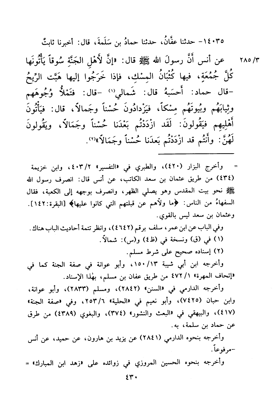 ١٤٠٣٥ - حَدَّثَنَا عَفَّانُ، حَدَّثَنَا حَمَّادُ بْنُ سَلَمَةَ، قَالَ: أَخْبَرَنَا ثَابِتٌ، عَنْ أَنَسٍ، أَنَّ رَسُولَ اللهِ صَلَّى اللهُ عَلَيْهِ وَسَلَّمَ قَالَ: " إِنَّ لِأَهْلِ الْجَنَّةِ سُوقًا يَأْتُونَهَا كُلَّ جُمُعَةٍ، فِيهَا كُثْبَانُ الْمِسْكِ، فَإِذَا خَرَجُوا إِلَيْهَا هَبَّتِ الرِّيحُ " - قَالَ حَمَّادٌ: أَحْسِبُهُ قَالَ: شَمَالِيٌّ (١) -، قَالَ: " فَتَمْلَأُ، وُجُوهَهُمْ، وَثِيَابَهُمْ، وَبُيُوتَهُمْ مِسْكًا، فَيَزْدَادُونَ حُسْنًا وَجَمَالًا "، قَالَ: " فَيَأْتُونَ أَهْلِيهِمْ فَيَقُولُونَ: لَقَدِ ازْدَدْتُمْ بَعْدَنَا حُسْنًا وَجَمَالًا، وَيَقُولُونَ لَهُنَّ: وَأَنْتُمْ قَدِ ازْدَدْتُمْ بَعْدَنَا حُسْنًا وَجَمَالًا " (٢)