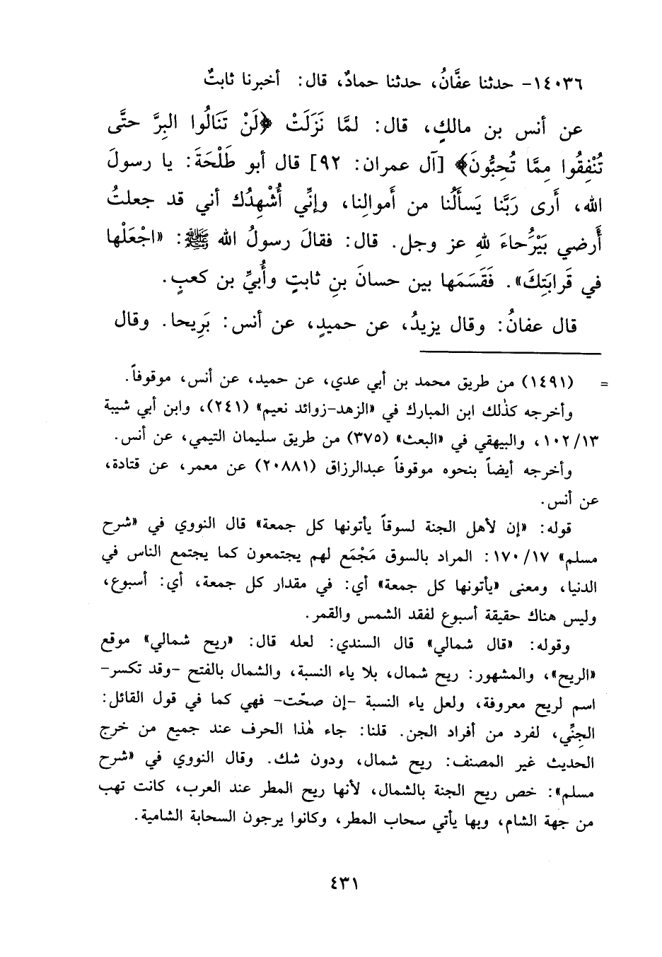١٤٠٣٦ - حَدَّثَنَا عَفَّانُ، حَدَّثَنَا حَمَّادٌ، قَالَ: أَخْبَرَنَا ثَابِتٌ، عَنْ أَنَسِ بْنِ مَالِكٍ، قَالَ: لَمَّا نَزَلَتْ: {لَنْ تَنَالُوا الْبِرَّ حَتَّى تُنْفِقُوا مِمَّا تُحِبُّونَ} [آل عمران: ٩٢] ، قَالَ أَبُو طَلْحَةَ: يَا رَسُولَ اللهِ، أَرَى رَبَّنَا يَسْأَلُنَا مِنْ أَمْوَالِنَا، وَإِنِّي أُشْهِدُكَ أَنِّي قَدْ جَعَلْتُ أَرْضِي بَيْرُحَاءَ لِلَّهِ عَزَّ وَجَلَّ، قَالَ: فَقَالَ رَسُولُ اللهِ صَلَّى اللهُ عَلَيْهِ وَسَلَّمَ: " اجْعَلْهَا فِي قَرَابَتِكَ "، فَقَسَمَهَا بَيْنَ حَسَّانَ بْنِ ثَابِتٍ، وَأُبَيِّ بْنِ كَعْبٍ، قَالَ عَفَّانُ: وَقَالَ يَزِيدُ: عَنْ حُمَيْدٍ، عَنْ أَنَسٍ: بَرِيحَا، وقَالَ