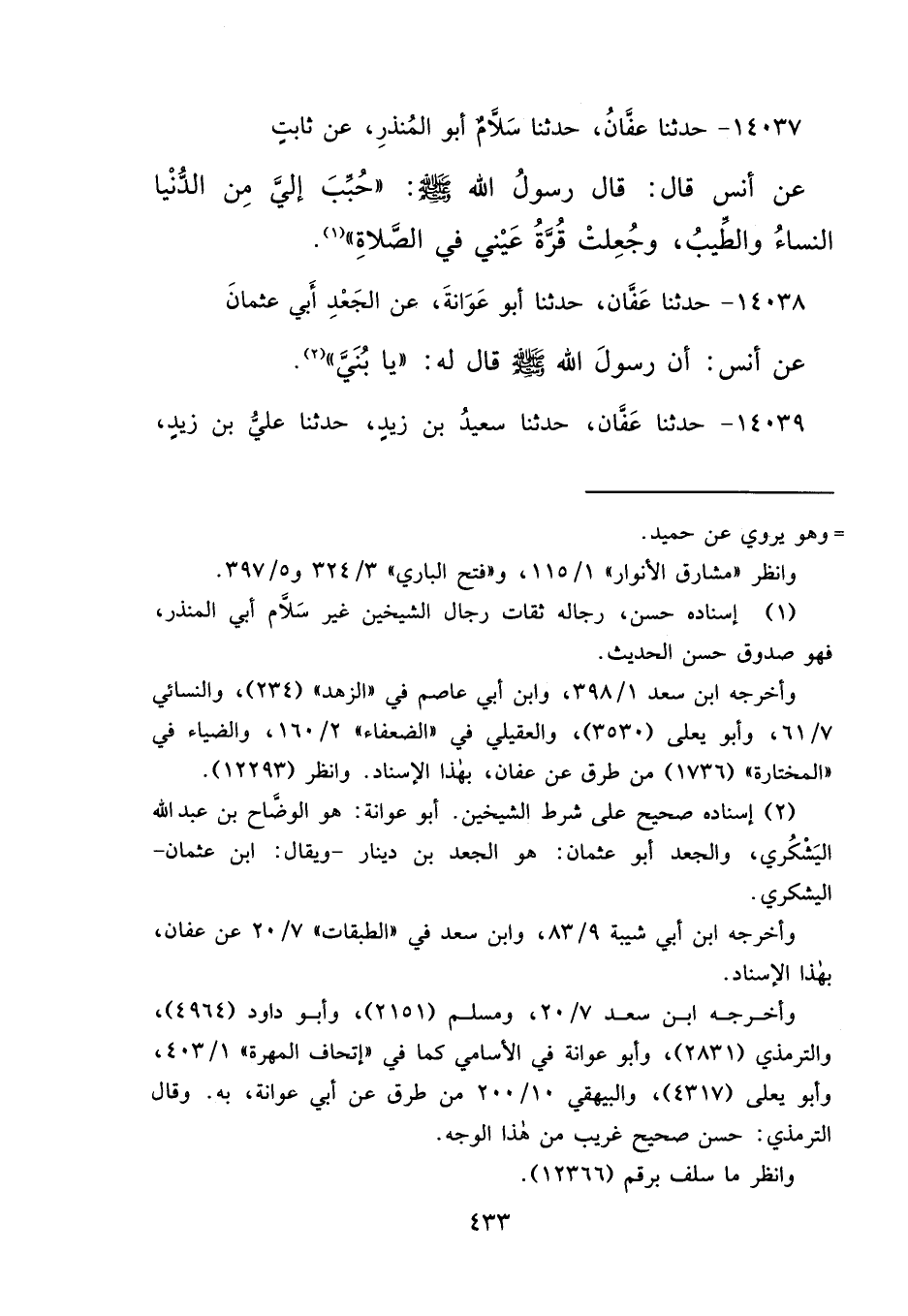 ١٤٠٣٧ - حَدَّثَنَا عَفَّانُ، حَدَّثَنَا سَلَّامُ أَبُو الْمُنْذِرِ، عَنْ ثَابِتٍ، عَنْ أَنَسٍ، قَالَ: قَالَ رَسُولُ اللهِ صَلَّى اللهُ عَلَيْهِ وَسَلَّمَ: " حُبِّبَ إِلَيَّ مِنَ الدُّنْيَا النِّسَاءُ، وَالطِّيبُ، وَجُعِلَتْ قُرَّةُ عَيْنِي فِي الصَّلَاةِ " (١)