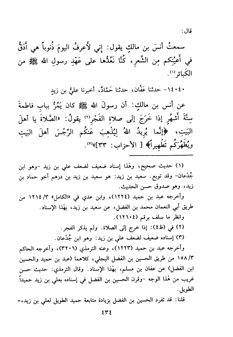 قَالَ: سَمِعْتُ أَنَسَ بْنَ مَالِكٍ، يَقُولُ: " إِنِّي لَأَعْرِفُ الْيَوْمَ ذُنُوبًا هِيَ أَدَقُّ فِي أَعْيُنِكُمْ مِنَ الشَّعْرِ، كُنَّا نَعُدُّهَا عَلَى عَهْدِ رَسُولِ اللهِ صَلَّى اللهُ عَلَيْهِ وَسَلَّمَ مِنَ الْكَبَائِرِ " (١)