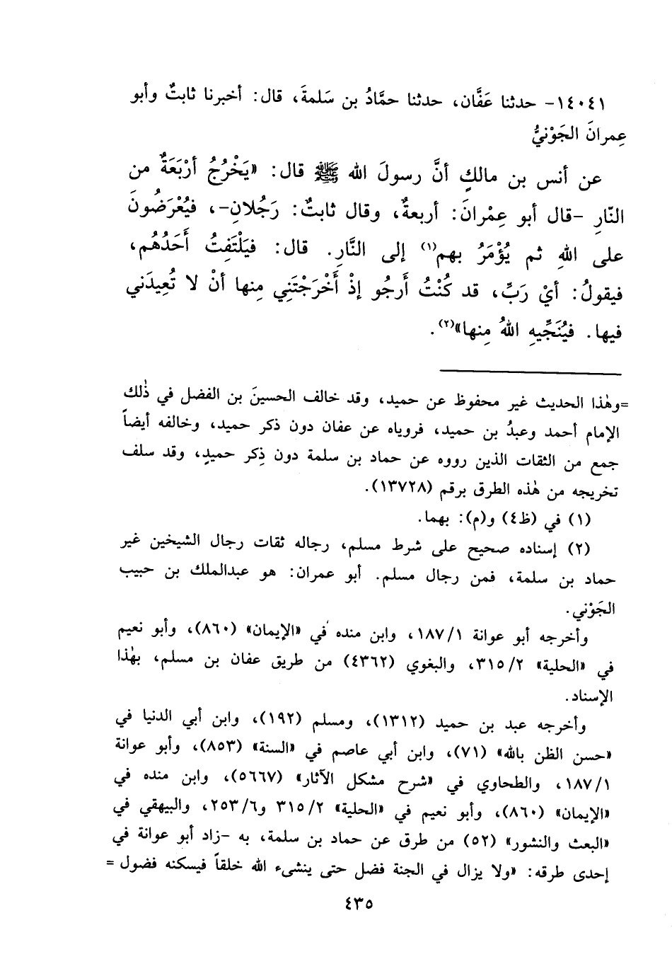 ١٤٠٤١ - حَدَّثَنَا عَفَّانُ، حَدَّثَنَا حَمَّادُ بْنُ سَلَمَةَ، قَالَ: أَخْبَرَنَا ثَابِتٌ، وَأَبُو عِمْرَانَ الْجَوْنِيُّ، عَنْ أَنَسِ بْنِ مَالِكٍ، أَنَّ رَسُولَ اللهِ صَلَّى اللهُ عَلَيْهِ وَسَلَّمَ قَالَ: " يَخْرُجُ أَرْبَعَةٌ مِنَ النَّارِ - قَالَ أَبُو عِمْرَانَ: أَرْبَعَةٌ، قَالَ ثَابِتٌ: رَجُلَانِ - فَيُعْرَضُونَ عَلَى اللهِ، ثُمَّ يُؤْمَرُ بِهِمْ (١) إِلَى النَّارِ، قَالَ: فَيَلْتَفِتُ أَحَدُهُمْ، فَيَقُولُ: أَيْ رَبِّ، قَدْ كُنْتُ أَرْجُو إِذَا أَخْرَجْتَنِي مِنْهَا أَنْ لَا تُعِيدَنِي فِيهَا، فَيُنْجِيهِ اللهُ مِنْهَا " (٢)