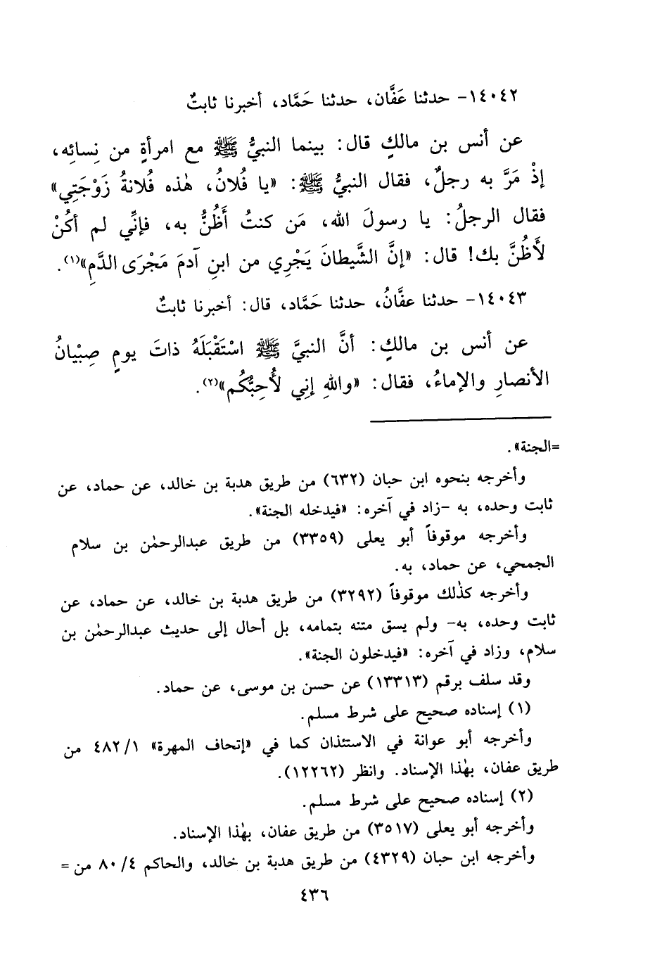 ١٤٠٤٢ - حَدَّثَنَا عَفَّانُ، حَدَّثَنَا حَمَّادٌ، أَخْبَرَنَا ثَابِتٌ، عَنْ أَنَسِ بْنِ مَالِكٍ، قَالَ: بَيْنَمَا النَّبِيُّ صَلَّى اللهُ عَلَيْهِ وَسَلَّمَ مَعَ امْرَأَةٍ مِنْ نِسَائِهِ، إِذْ مَرَّ بِهِ رَجُلٌ، فَقَالَ النَّبِيُّ صَلَّى اللهُ عَلَيْهِ وَسَلَّمَ: " يَا فُلَانُ، هَذِهِ فُلَانَةُ زَوْجَتِي "، فَقَالَ: الرَّجُلُ: يَا رَسُولَ اللهِ، مَنْ كُنْتُ أَظُنُّ بِهِ، فَإِنِّي لَمْ أَكُنْ لِأَظُنَّ بِكَ، قَالَ: " إِنَّ الشَّيْطَانَ يَجْرِي مِنْ ابْنِ آدَمَ مَجْرَى الدَّمِ " (١)