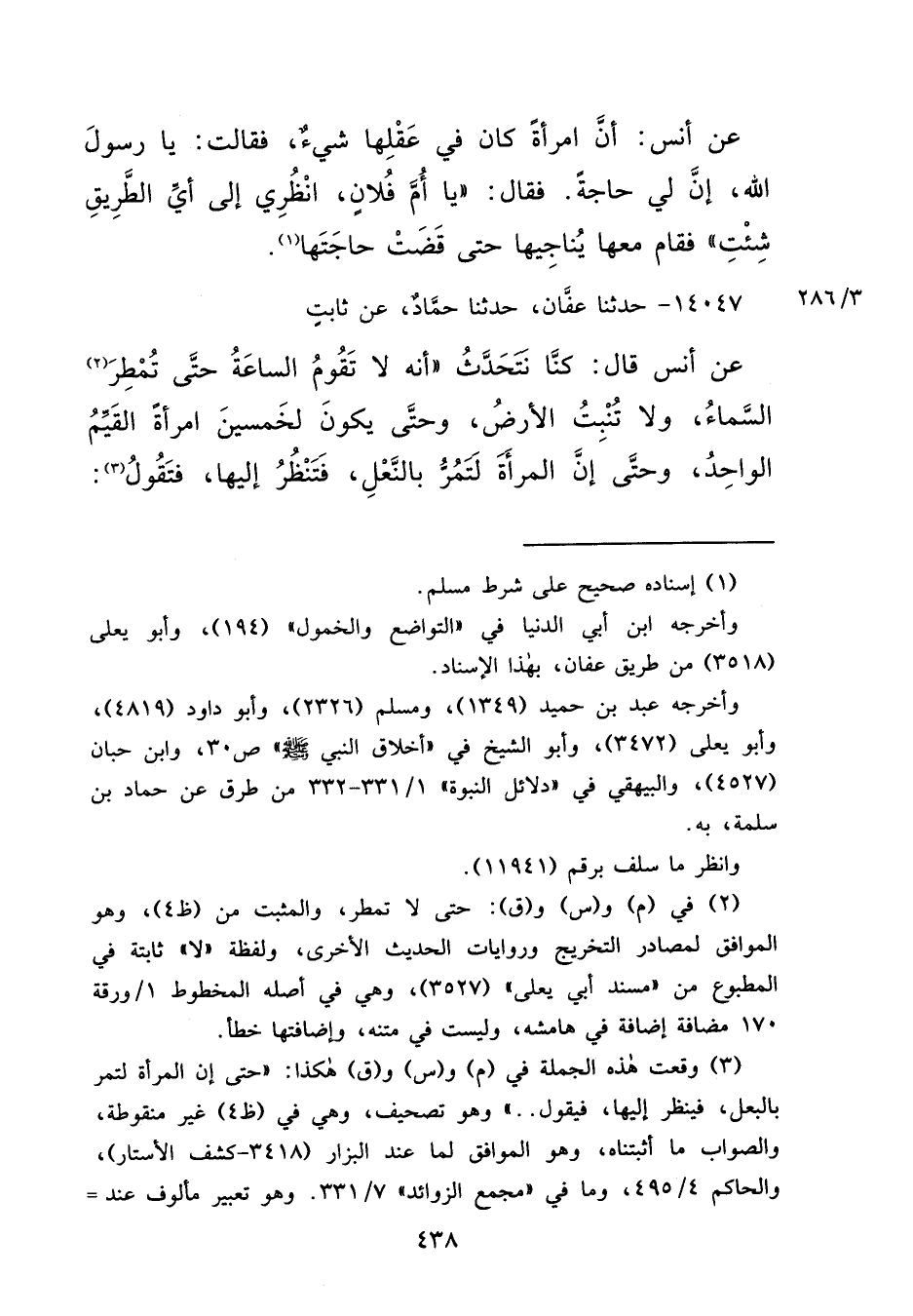 عَنْ أَنَسٍ، أَنَّ امْرَأَةً كَانَ فِي عَقْلِهَا شَيْءٌ، فَقَالَتْ: يَا رَسُولَ اللهِ إِنَّ لِي حَاجَةً؟ فَقَالَ: " يَا أُمَّ فُلَانٍ، انْظُرِي إِلَى أَيِّ الطَّرِيقِ شِئْتِ "، فَقَامَ مَعَهَا يُنَاجِيهَا حَتَّى قَضَتْ حَاجَتَهَا " (١)