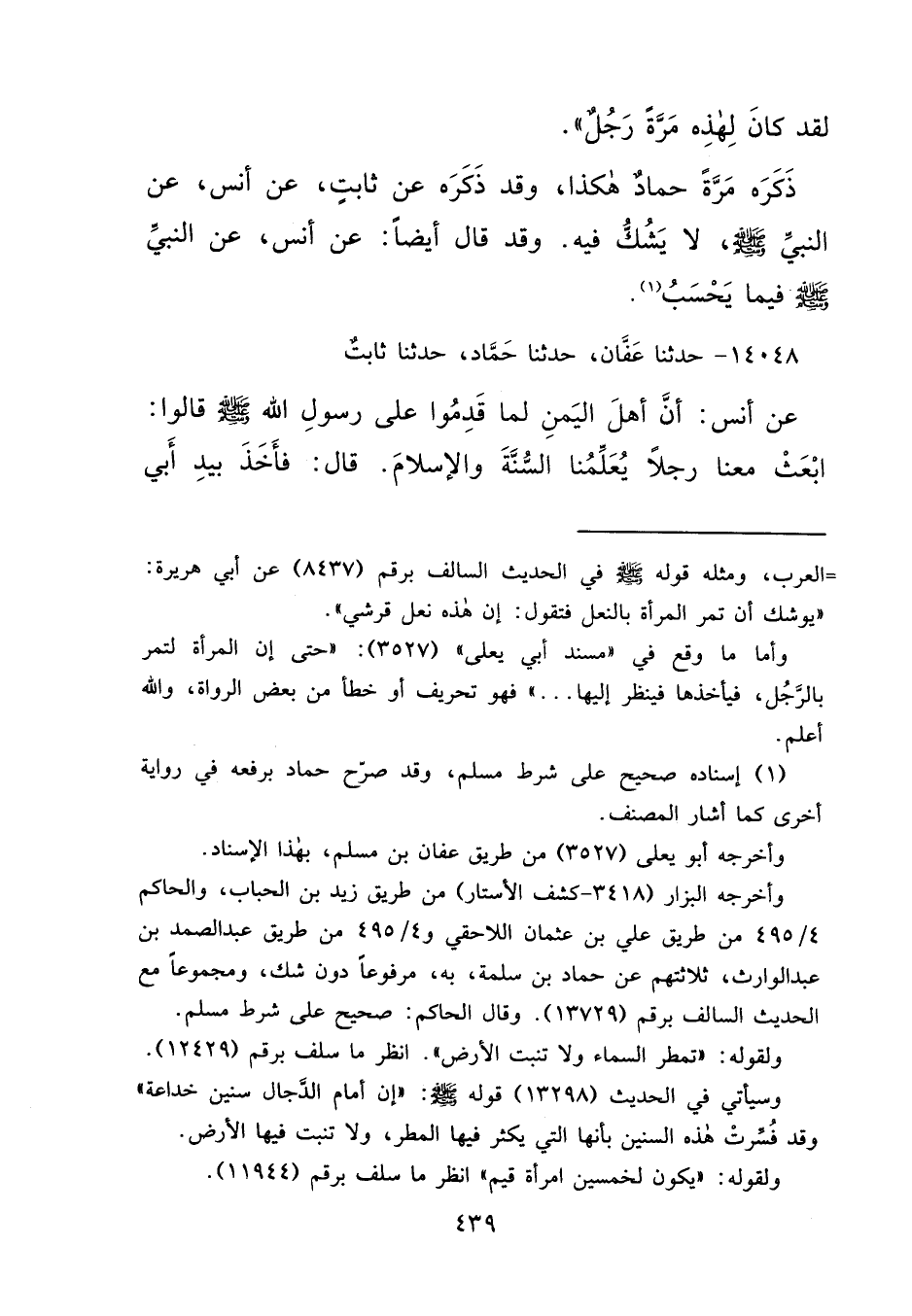 لَقَدْ كَانَ لِهَذِهِ مَرَّةً رَجُلٌ "، ذَكَرَهُ مَرَّةً حَمَّادٌ، هَكَذَا، وَقَدْ ذَكَرَهُ عَنْ ثَابِتٍ، عَنْ أَنَسٍ، عَنِ النَّبِيِّ صَلَّى اللهُ عَلَيْهِ وَسَلَّمَ، لَا يَشُكُّ فِيهِ، وَقَدْ قَالَ أَيْضًا: عَنْ أَنَسٍ، عَنِ النَّبِيِّ صَلَّى اللهُ عَلَيْهِ وَسَلَّمَ، فِيمَا يَحْسِبُ (١)