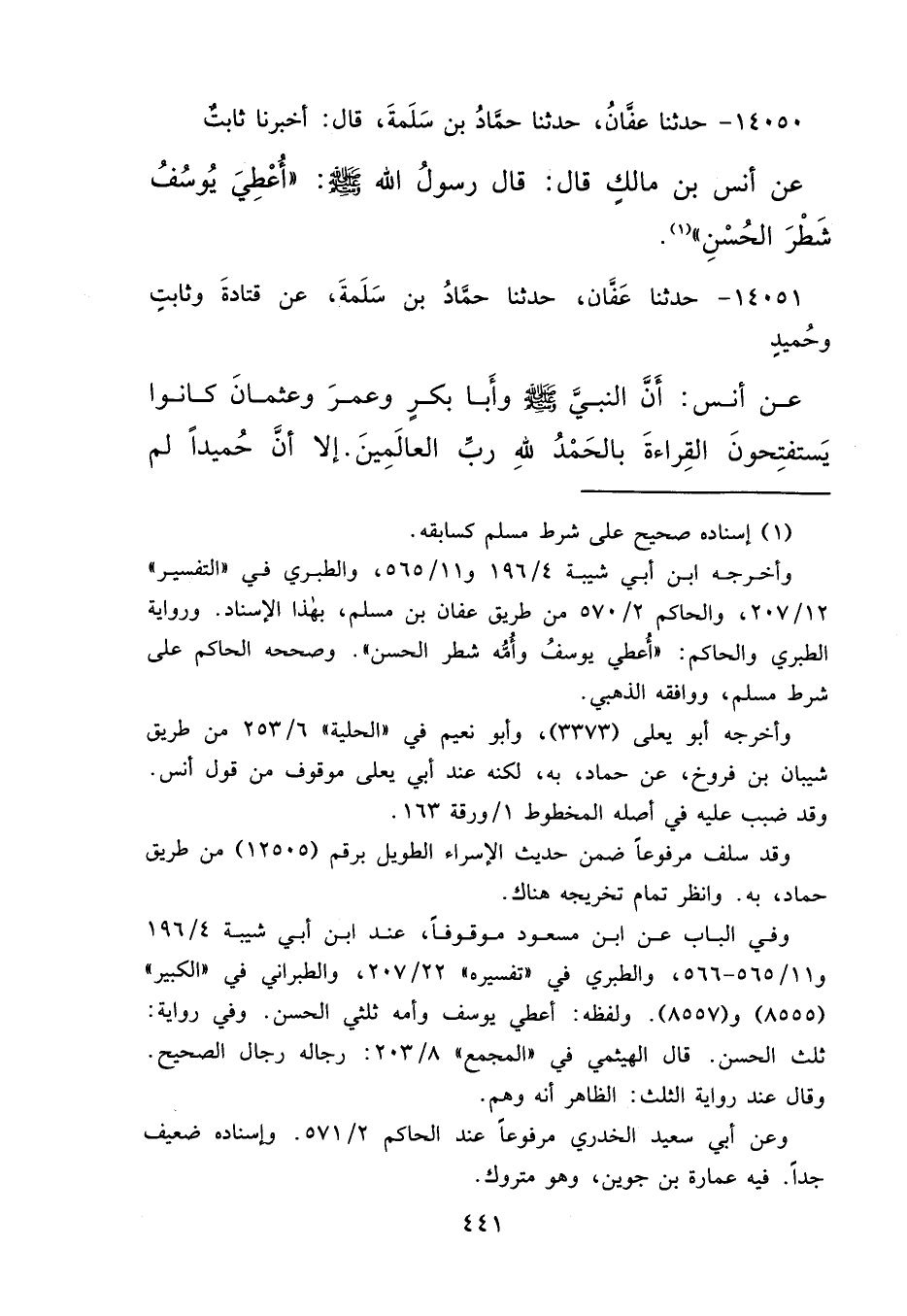 ١٤٠٥٠ - حَدَّثَنَا عَفَّانُ، حَدَّثَنَا حَمَّادُ بْنُ سَلَمَةَ، قَالَ: أَخْبَرَنَا ثَابِتٌ، عَنْ أَنَسِ بْنِ مَالِكٍ، قَالَ: قَالَ رَسُولُ اللهِ صَلَّى اللهُ عَلَيْهِ وَسَلَّمَ: " أُعْطِيَ يُوسُفُ شَطْرَ الْحُسْنِ " (١)