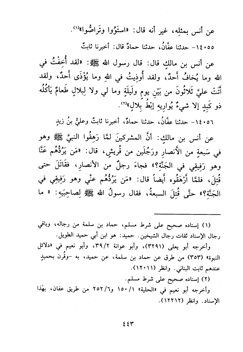 ١٤٠٥٥ - حَدَّثَنَا عَفَّانُ، حَدَّثَنَا حَمَّادٌ، قَالَ: أَخْبَرَنَا ثَابِتٌ، عَنْ أَنَسِ بْنِ مَالِكٍ، قَالَ: قَالَ رَسُولَ اللهِ صَلَّى اللهُ عَلَيْهِ وَسَلَّمَ قَالَ: " لَقَدْ أُخِفْتُ فِي اللهِ وَمَا يَخَافُ أَحَدٌ، وَلَقَدْ أُوذِيتُ فِي اللهِ وَمَا يُؤْذَى أَحَدٌ، وَلَقَدْ أَتَتْ عَلَيَّ ثَلَاثُونَ مِنْ بَيْنِ يَوْمٍ وَلَيْلَةٍ، وَمَا لِي وَلَا لِبِلَالٍ طَعَامٌ يَأْكُلُهُ ذُو كَبِدٍ إِلَّا شَيْءٌ يُوَارِيهِ إِبِطُ بِلَالٍ " (٢)