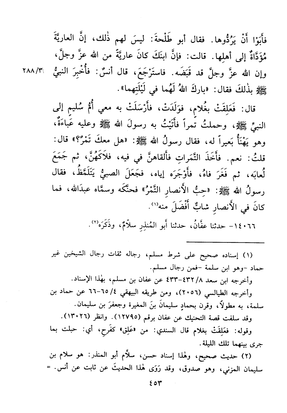 وقد سلفت قصة التحنيك عن عفان برقم (١٢٧٩٥) . وانظر (١٣٠٢٦) .