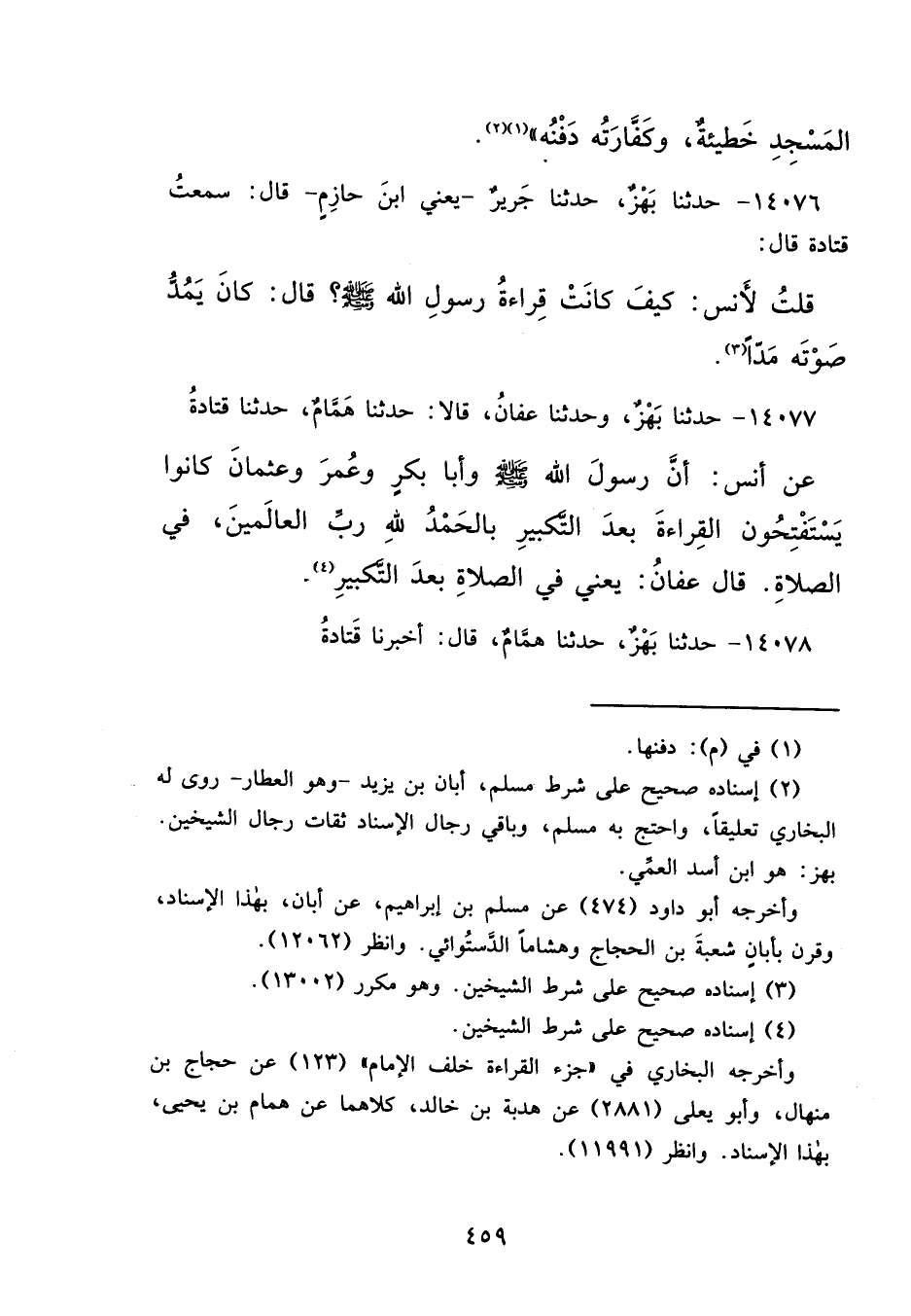 ١٤٠٧٦ - حَدَّثَنَا بَهْزٌ، حَدَّثَنَا جَرِيرٌ يَعْنِي ابْنَ حَازِمٍ، قَالَ: سَمِعْتُ قَتَادَةَ، قَالَ: قُلْتُ لِأَنَسٍ: كَيْفَ كَانَتْ قِرَاءَةُ رَسُولِ اللهِ صَلَّى اللهُ عَلَيْهِ وَسَلَّمَ؟ قَالَ: " كَانَ يَمُدُّ صَوْتَهُ مَدًّا " (٣)