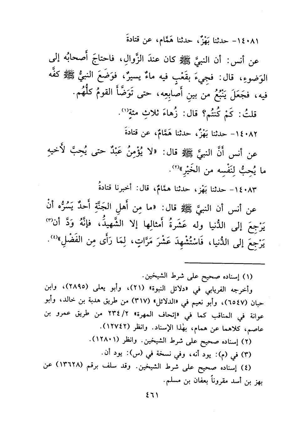١٤٠٨١ - حَدَّثَنَا بَهْزٌ، حَدَّثَنَا هَمَّامٌ، عَنْ قَتَادَةَ، عَنْ أَنَسٍ، أَنَّ النَّبِيَّ صَلَّى اللهُ عَلَيْهِ وَسَلَّمَ كَانَ عِنْدَ الزَّوَالِ، فَاحْتَاجَ أَصْحَابُهُ إِلَى الْوُضُوءِ، قَالَ: " فَجِيءَ بِقَعْبٍ فِيهِ مَاءٌ يَسِيرٌ، فَوَضَعَ النَّبِيُّ صَلَّى اللهُ عَلَيْهِ وَسَلَّمَ كَفَّهُ فِيهِ، فَجَعَلَ يَنْبُعُ مِنْ بَيْنِ أَصَابِعِهِ حَتَّى تَوَضَّأَ الْقَوْمُ كُلُّهُمْ "، قُلْتُ: كَمْ كُنْتُمْ؟ قَالَ: " زُهَاءَ ثَلَاثِ مِائَةٍ " (١)