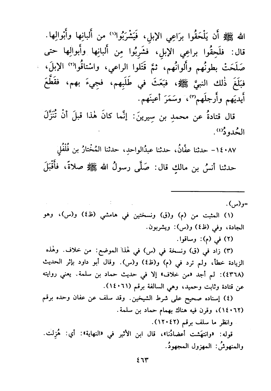 اللهِ صَلَّى اللهُ عَلَيْهِ وَسَلَّمَ أَنْ يَلْحَقُوا بِرَاعِي الْإِبِلِ، فَيَشْرَبُوا (١) مِنْ أَلْبَانِهَا، وَأَبْوَالِهَا "، قَالَ: " فَلَحِقُوا بِرَاعِي الْإِبِلِ، فَشَرِبُوا مِنْ أَلْبَانِهَا، وَأَبْوَالِهَا حَتَّى صَلُحَتْ بُطُونُهُمْ، وَأَلْوَانُهُمْ، ثُمَّ قَتَلُوا الرَّاعِي، وَاسْتَاقُوا (٢) الْإِبِلَ، فَبَلَغَ ذَلِكَ النَّبِيَّ صَلَّى اللهُ عَلَيْهِ وَسَلَّمَ، فَبَعَثَ فِي طَلَبِهِمْ، فَجِيءَ بِهِمْ، فَقَطَعَ أَيْدِيَهُمْ وَأَرْجُلَهُمْ، (٣) وَسَمَرَ أَعْيُنَهُمْ "، قَالَ قَتَادَةُ: عَنْ مُحَمَّدِ بْنِ سِيرِينَ: " إِنَّمَا كَانَ هَذَا قَبْلَ أَنْ تَنْزِلَ الْحُدُودُ " (٤)