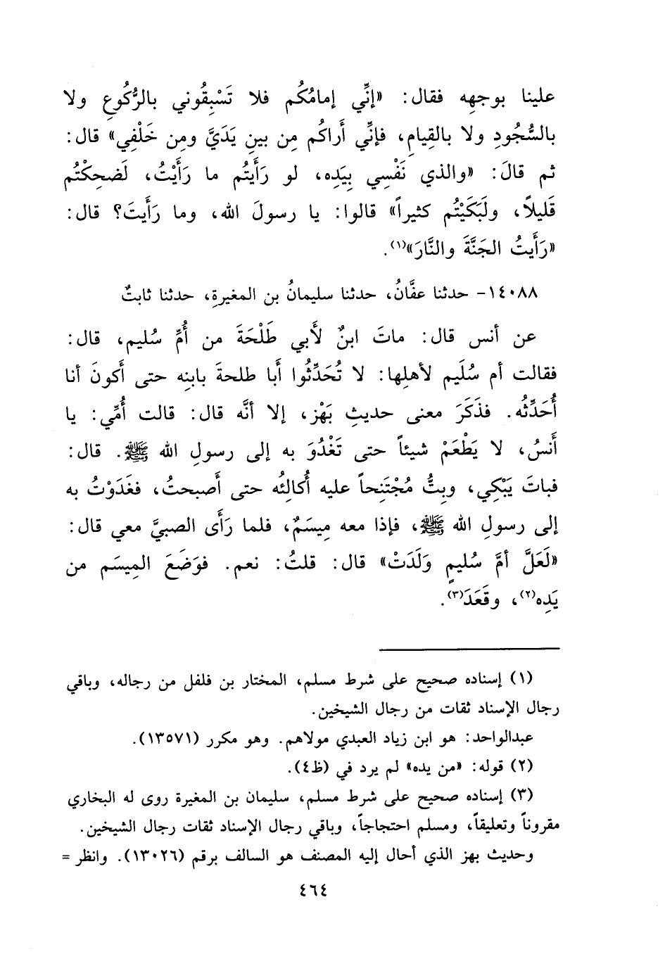 ١٤٠٨٨ - حَدَّثَنَا عَفَّانُ، حَدَّثَنَا سُلَيْمَانُ بْنُ الْمُغِيرَةِ، حَدَّثَنَا ثَابِتٌ، عَنْ أَنَسٍ، قَالَ: مَاتَ ابْنٌ لِأَبِي طَلْحَةَ مِنْ أُمِّ سُلَيْمٍ، قَالَ: فَقَالَتْ أُمُّ سُلَيْمٍ لِأَهْلِهَا: لَا تُحَدِّثُوا أَبَا طَلْحَةَ بِابْنِهِ حَتَّى أَكُونَ أَنَا أُحَدِّثُهُ - فَذَكَرَ مَعْنَى حَدِيثِ بَهْزٍ إِلَّا أَنَّهُ قَالَ: - قَالَتْ أُمِّي: يَا أَنَسُ، لَا يُطْعَمْ شَيْئًا حَتَّى تَغْدُوَ بِهِ إِلَى رَسُولِ اللهِ صَلَّى اللهُ عَلَيْهِ وَسَلَّمَ، قَالَ: فَبَاتَ يَبْكِي، وَبِتُّ مُجْتَنِحًا عَلَيْهِ أُكَالِئُهُ حَتَّى أَصْبَحْتُ، فَغَدَوْتُ بِهِ إِلَى رَسُولِ اللهِ صَلَّى اللهُ عَلَيْهِ وَسَلَّمَ، فَإِذَا مَعَهُ مِيسَمٌ، فَلَمَّا رَأَى الصَّبِيَّ مَعِي قَالَ: " لَعَلَّ أُمَّ سُلَيْمٍ وَلَدَتْ "، قَالَ: قُلْتُ: نَعَمْ، فَوَضَعَ الْمِيسَمَ مِنْ يَدِهِ (٢) وَقَعَدَ (٣)