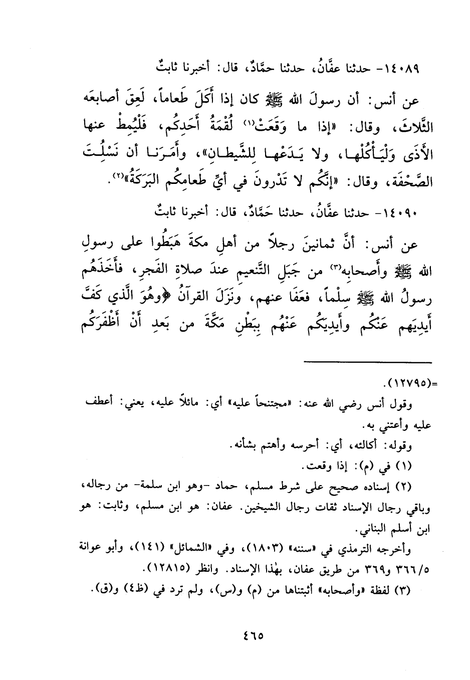 ١٤٠٨٩ - حَدَّثَنَا عَفَّانُ، حَدَّثَنَا حَمَّادٌ، قَالَ: أَخْبَرَنَا ثَابِتٌ، عَنْ أَنَسٍ، أَنَّ رَسُولَ اللهِ صَلَّى اللهُ عَلَيْهِ وَسَلَّمَ كَانَ إِذَا أَكَلَ طَعَامًا لَعِقَ أَصَابِعَهُ الثَّلَاثَ، وَقَالَ: " إِذَا مَا وَقَعَتْ (١) لُقْمَةُ أَحَدِكُمْ، فَلْيُمِطْ عَنْهَا الْأَذَى وَلْيَأْكُلْهَا، وَلَا يَدَعْهَا لِلشَّيْطَانِ "، وَأَمَرَنَا أَنْ نَسْلِتَ الصَّحْفَةَ، وَقَالَ: " إِنَّكُمْ لَا تَدْرُونَ فِي أَيِّ طَعَامِكُمُ الْبَرَكَةَ " (٢)