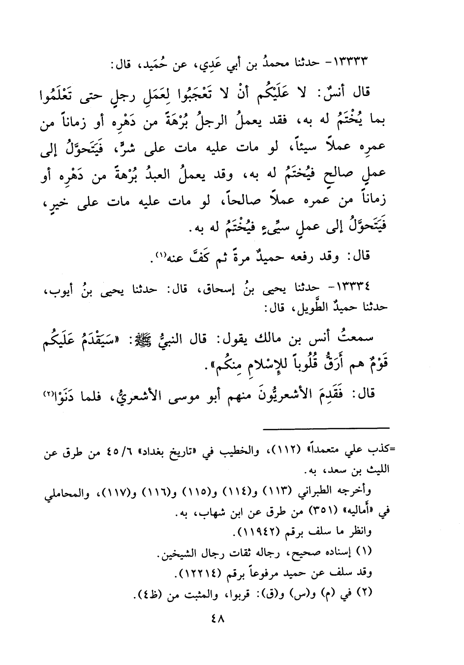 ١٣٣٣٣ - حَدَّثَنَا مُحَمَّدُ بْنُ أَبِي عَدِيٍّ، عَنْ حُمَيْدٍ قَالَ: قَالَ أَنَسٌ " لَا عَلَيْكُمْ أَنْ لَا تَعْجَبُوا لِعَمَلِ رَجُلٍ حَتَّى تَعْلَمُوا بِمَا يُخْتَمُ لَهُ بِهِ، فَقَدْ يَعْمَلُ الرَّجُلُ بُرْهَةً مِنْ دَهْرِهِ - أَوْ زَمَانًا - مِنْ عُمْرِهِ عَمَلًا سَيِّئًا، لَوْ مَاتَ عَلَيْهِ مَاتَ عَلَى شَرٍّ، فَيَتَحَوَّلُ إِلَى عَمَلٍ صَالِحٍ، فَيُخْتَمُ لَهُ بِهِ، وَقَدْ يَعْمَلُ الْعَبْدُ بُرْهَةً مِنْ دَهْرِهِ - أَوْ زَمَانًا - مِنْ عُمْرِهِ عَمَلًا صَالِحًا، لَوْ مَاتَ عَلَيْهِ مَاتَ عَلَى خَيْرٍ، فَيَتَحَوَّلُ إِلَى عَمَلٍ سَيِّئٍ، فَيُخْتَمُ لَهُ بِهِ " قَالَ: وَقَدْ رَفَعَهُ حُمَيْدٌ مَرَّةً، ثُمَّ كَفَّ عَنْهُ (١)