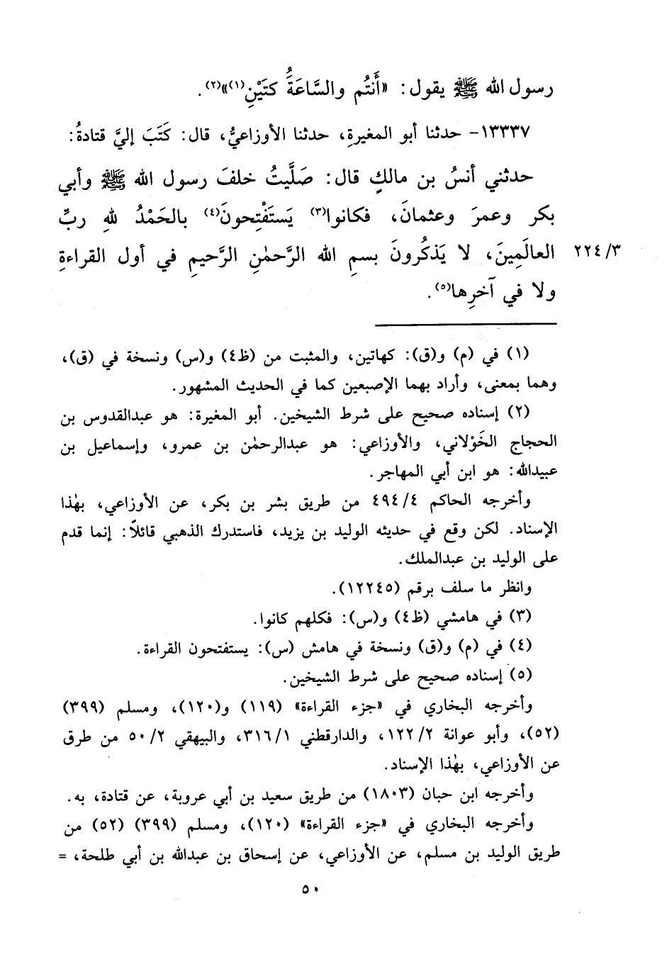 ١٣٣٣٧ - حَدَّثَنَا أَبُو الْمُغِيرَةِ، حَدَّثَنَا الْأَوْزَاعِيُّ، قَالَ: كَتَبَ إِلَيَّ قَتَادَةُ، حَدَّثَنِي أَنَسُ بْنُ مَالِكٍ قَالَ: " صَلَّيْتُ خَلْفَ رَسُولِ اللهِ صَلَّى اللهُ عَلَيْهِ وَسَلَّمَ، وَأَبِي بَكْرٍ، وَعُمَرَ، وَعُثْمَانَ، فَكَانُوا (٣) يَسْتَفْتِحُونَ (٤) بِـ {الْحَمْدُ لِلَّهِ رَبِّ الْعَالَمِينَ} [الفاتحة: ٢] ، لَا يَذْكُرُونَ {بِسْمِ اللهِ الرَّحْمَنِ الرَّحِيمِ} [الفاتحة: ١] فِي أَوَّلِ الْقِرَاءَةِ، وَلَا فِي آخِرِهَا " (٥)
