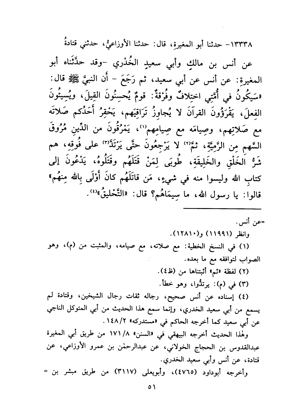 ١٣٣٣٨ - حَدَّثَنَا أَبُو الْمُغِيرَةِ، قَالَ: حَدَّثَنَا الْأَوْزَاعِيُّ، حَدَّثَنِي قَتَادَةُ، عَنْ أَنَسِ بْنِ مَالِكٍ، وَأَبِي سَعِيدٍ الْخُدْرِيِّ، وَقَدْ حَدَّثَنَاهُ أَبُو الْمُغِيرَةِ، عَنْ أَنَسٍ، عَنْ أَبِي سَعِيدٍ، ثُمَّ رَجَعَ أَنَّ النَّبِيَّ صَلَّى اللهُ عَلَيْهِ وَسَلَّمَ قَالَ: " سَيَكُونُ فِي أُمَّتِي اخْتِلَافٌ وَفُرْقَةٌ، قَوْمٌ يُحْسِنُونَ الْقِيلَ، وَيُسِيئُونَ الْفِعْلَ، يَقْرَءُونَ الْقُرْآنَ لَا يُجَاوِزُ تَرَاقِيَهُمْ، يَحْقِرُ أَحَدُكُمْ صَلَاتَهُ مَعَ صَلَاتِهِمْ، وَصِيَامَهُ مَعَ صِيَامِهِمْ، (١) يَمْرُقُونَ مِنَ الدِّينِ مُرُوقَ السَّهْمِ مِنَ الرَّمِيَّةِ، ثُمَّ (٢) لَا يَرْجِعُونَ حَتَّى يَرْتَدَّ (٣) عَلَى فُوقِهِ، هُمْ شَرُّ الْخَلْقِ وَالْخَلِيقَةِ، طُوبَى لِمَنْ قَتَلَهُمْ وَقَتَلُوهُ، يَدْعُونَ إِلَى كِتَابِ اللهِ، وَلَيْسُوا مِنْهُ فِي شَيْءٍ، مَنْ قَاتَلَهُمْ كَانَ أَوْلَى بِاللهِ مِنْهُمْ ". قَالُوا: يَا رَسُولَ اللهِ، مَا سِيمَاهُمْ؟ قَالَ: " التَّحْلِيقُ " (٤)