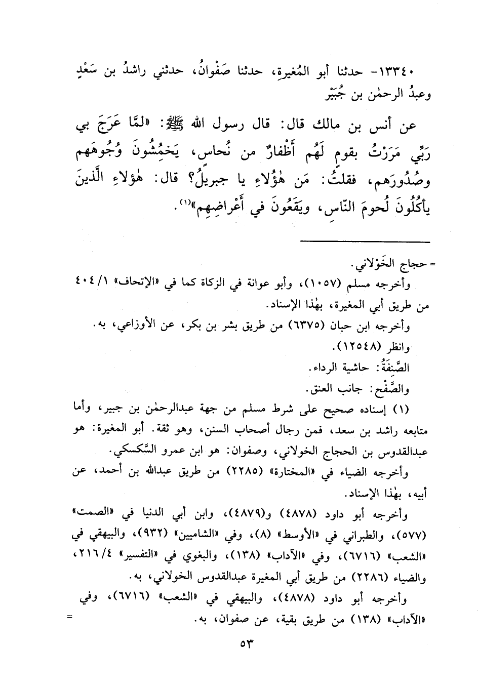 ١٣٣٤٠ - حَدَّثَنَا أَبُو الْمُغِيرَةِ، حَدَّثَنَا صَفْوَانُ، حَدَّثَنِي رَاشِدُ بْنُ سَعْدٍ، وَعَبْدُ الرَّحْمَنِ بْنُ جُبَيْرٍ، عَنْ أَنَسِ بْنِ مَالِكٍ قَالَ: قَالَ رَسُولُ اللهِ صَلَّى اللهُ عَلَيْهِ وَسَلَّمَ: " لَمَّا عَرَجَ بِي رَبِّي مَرَرْتُ بِقَوْمٍ لَهُمْ أَظْفَارٌ مِنْ نُحَاسٍ، يَخْمُشُونَ وُجُوهَهُمْ وَصُدُورَهُمْ. فَقُلْتُ: مَنْ هَؤُلَاءِ يَا جِبْرِيلُ؟ قَالَ: هَؤُلَاءِ الَّذِينَ يَأْكُلُونَ لُحُومَ النَّاسِ، وَيَقَعُونَ فِي أَعْرَاضِهِمْ " (١)