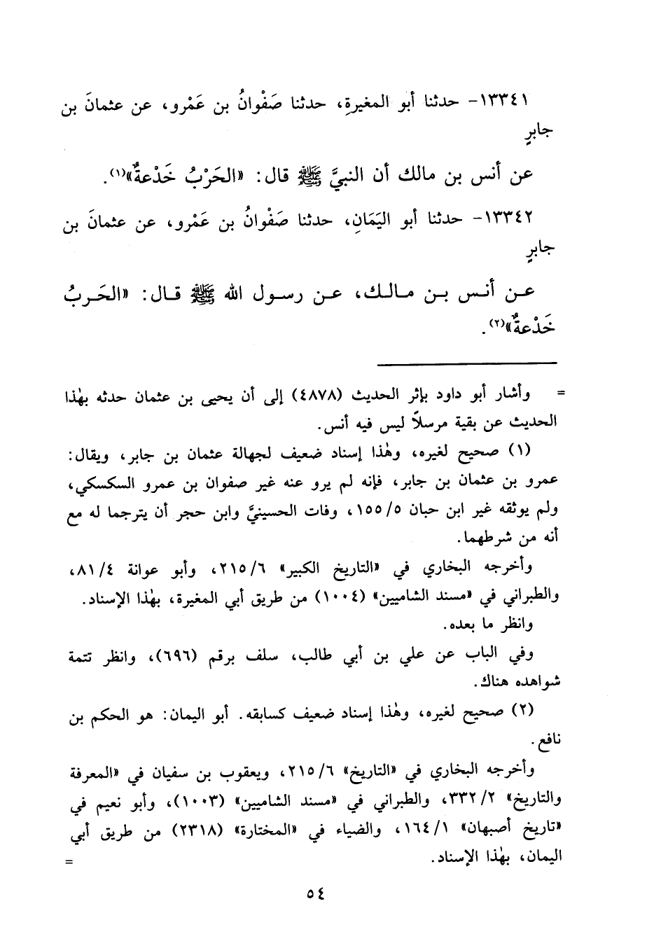 ١٣٣٤١ - حَدَّثَنَا أَبُو الْمُغِيرَةِ، حَدَّثَنَا صَفْوَانُ بْنُ عَمْرٍو، عَنْ عُثْمَانَ بْنِ جَابِرٍ، عَنْ أَنَسِ بْنِ مَالِكٍ، أَنَّ النَّبِيَّ صَلَّى اللهُ عَلَيْهِ وَسَلَّمَ قَالَ: " الْحَرْبُ خُدْعَةٌ " (١)
