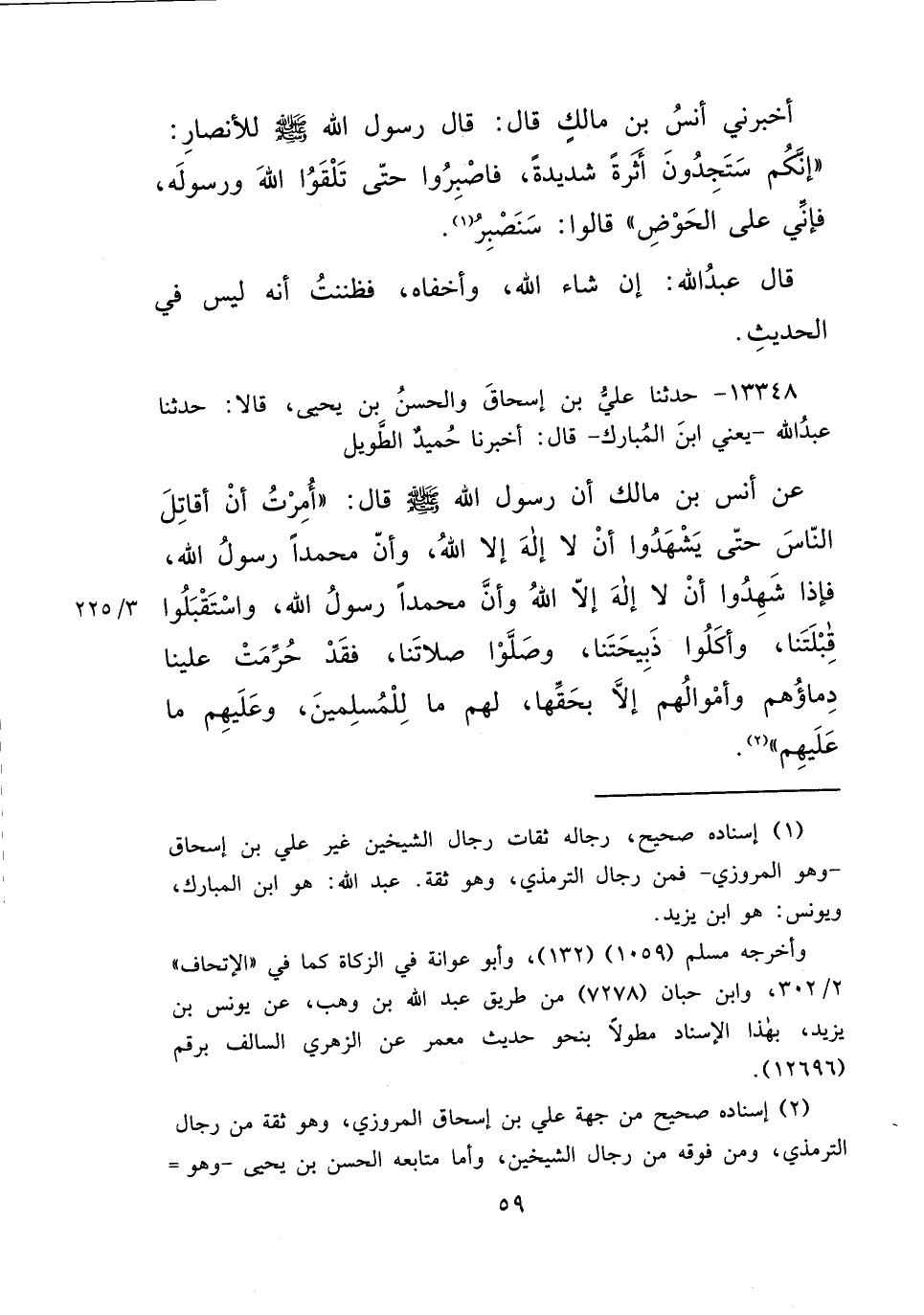 ١٣٣٤٨ - حَدَّثَنَا عَلِيُّ بْنُ إِسْحَاقَ، وَالْحَسَنُ بْنُ يَحْيَى، قَالَا: حَدَّثَنَا عَبْدُ اللهِ يَعْنِي ابْنَ الْمُبَارَكِ، قَالَ: أَخْبَرَنَا حُمَيْدٌ الطَّوِيلُ، عَنْ أَنَسِ بْنِ مَالِكٍ، أَنَّ رَسُولَ اللهِ صَلَّى اللهُ عَلَيْهِ وَسَلَّمَ قَالَ: " أُمِرْتُ أَنْ أُقَاتِلَ النَّاسَ حَتَّى يَشْهَدُوا أَنْ لَا إِلَهَ إِلَّا اللهُ، وَأَنَّ مُحَمَّدًا رَسُولُ اللهِ، فَإِذَا شَهِدُوا أَنْ لَا إِلَهَ إِلَّا اللهُ، وَأَنَّ مُحَمَّدًا رَسُولُ اللهِ، وَاسْتَقْبَلُوا قِبْلَتَنَا، وَأَكَلُوا ذَبِيحَتَنَا، وَصَلَّوْا صَلَاتَنَا، فَقَدْ حَرُمَتْ عَلَيْنَا دِمَاؤُهُمْ وَأَمْوَالُهُمْ إِلَّا بِحَقِّهَا، لَهُمْ مَا لِلْمُسْلِمِينَ، وَعَلَيْهِمْ مَا عَلَيْهِمْ " (٢)