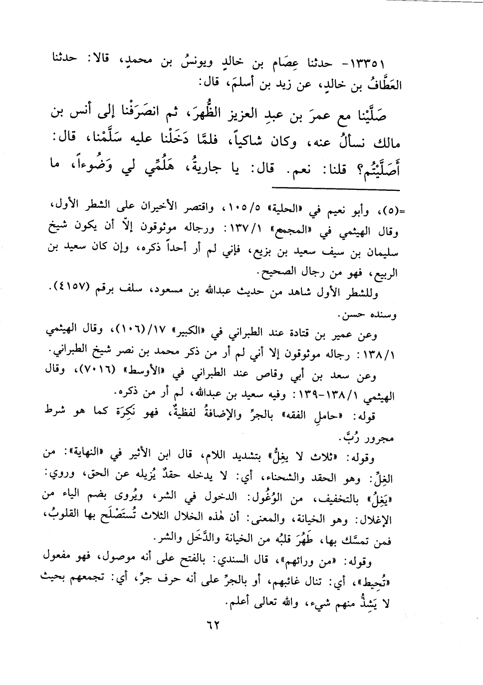 ١٣٣٥١ - حَدَّثَنَا عِصَامُ بْنُ خَالِدٍ، وَيُونُسُ بْنُ مُحَمَّدٍ، قَالَا: حَدَّثَنَا الْعَطَّافُ بْنُ خَالِدٍ، عَنْ زَيْدِ بْنِ أَسْلَمَ، قَالَ: صَلَّيْنَا مَعَ عُمَرَ بْنِ عَبْدِ الْعَزِيزِ الظُّهْرَ، ثُمَّ انْصَرَفْنَا إِلَى أَنَسِ بْنِ مَالِكٍ نَسْأَلُ عَنْهُ، وَكَانَ شَاكِيًا، فَلَمَّا دَخَلْنَا عَلَيْهِ سَلَّمْنَا قَالَ: " أَصَلَّيْتُمْ "؟ قُلْنَا: نَعَمْ، قَالَ: " يَا جَارِيَةُ هَلُمِّي لِي وَضُوءًا، مَا