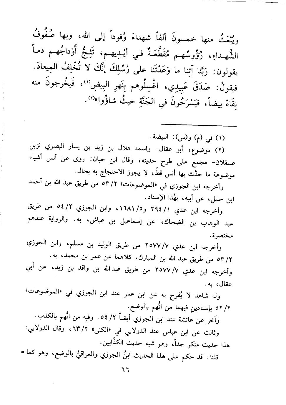وَيُبْعَثُ مِنْهَا خَمْسُونَ أَلْفًا شُهَدَاءَ، وُفُودًا إِلَى اللهِ، وَبِهَا صُفُوفُ الشُّهَدَاءِ، رُءُوسُهُمْ مُقَطَّعَةٌ فِي أَيْدِيهِمْ، تَثِجُّ أَوْدَاجُهُمْ دَمًا يَقُولُونَ: رَبَّنَا آتِنَا مَا وَعَدْتَنَا عَلَى رُسُلِكَ إِنَّكَ لَا تُخْلِفُ الْمِيعَادَ، فَيَقُولُ: صَدَقَ عَبِيدِي، اغْسِلُوهُمْ بِنَهَرِ الْبَيْضَةِ، (١) فَيَخْرُجُونَ مِنْهُ نَقَاءً بِيضًا، فَيَسْرَحُونَ فِي الْجَنَّةِ حَيْثُ شَاءُوا " (٢)