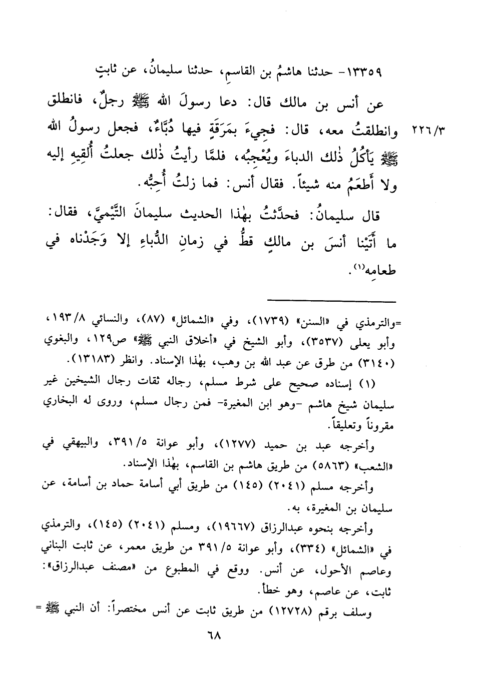 ١٣٣٥٩ - حَدَّثَنَا هَاشِمُ بْنُ الْقَاسِمِ، حَدَّثَنَا سُلَيْمَانُ، عَنْ ثَابِتٍ، عَنْ أَنَسِ بْنِ مَالِكٍ قَالَ: " دَعَا رَسُولَ اللهِ صَلَّى اللهُ عَلَيْهِ وَسَلَّمَ رَجُلٌ، فَانْطَلَقَ وَانْطَلَقْتُ مَعَهُ، قَالَ: فَجِيءَ بِمَرَقَةٍ فِيهَا دُبَّاءٌ، فَجَعَلَ رَسُولُ اللهِ صَلَّى اللهُ عَلَيْهِ وَسَلَّمَ يَأْكُلُ ذَلِكَ الدُّبَّاءَ وَيُعْجِبُهُ، فَلَمَّا رَأَيْتُ ذَلِكَ جَعَلْتُ أُلْقِيهِ إِلَيْهِ وَلَا أَطْعَمُ مِنْهُ شَيْئًا "، فَقَالَ أَنَسٌ: " فَمَا زِلْتُ أُحِبُّهُ " قَالَ سُلَيْمَانُ: فَحَدَّثْتُ بِهَذَا الْحَدِيثِ سُلَيْمَانَ التَّيْمِيَّ فَقَالَ: " مَا أَتَيْنَا أَنَسَ بْنَ مَالِكٍ قَطُّ فِي زَمَانِ الدُّبَّاءِ إِلَّا وَجَدْنَاهُ فِي طَعَامِهِ " (١)