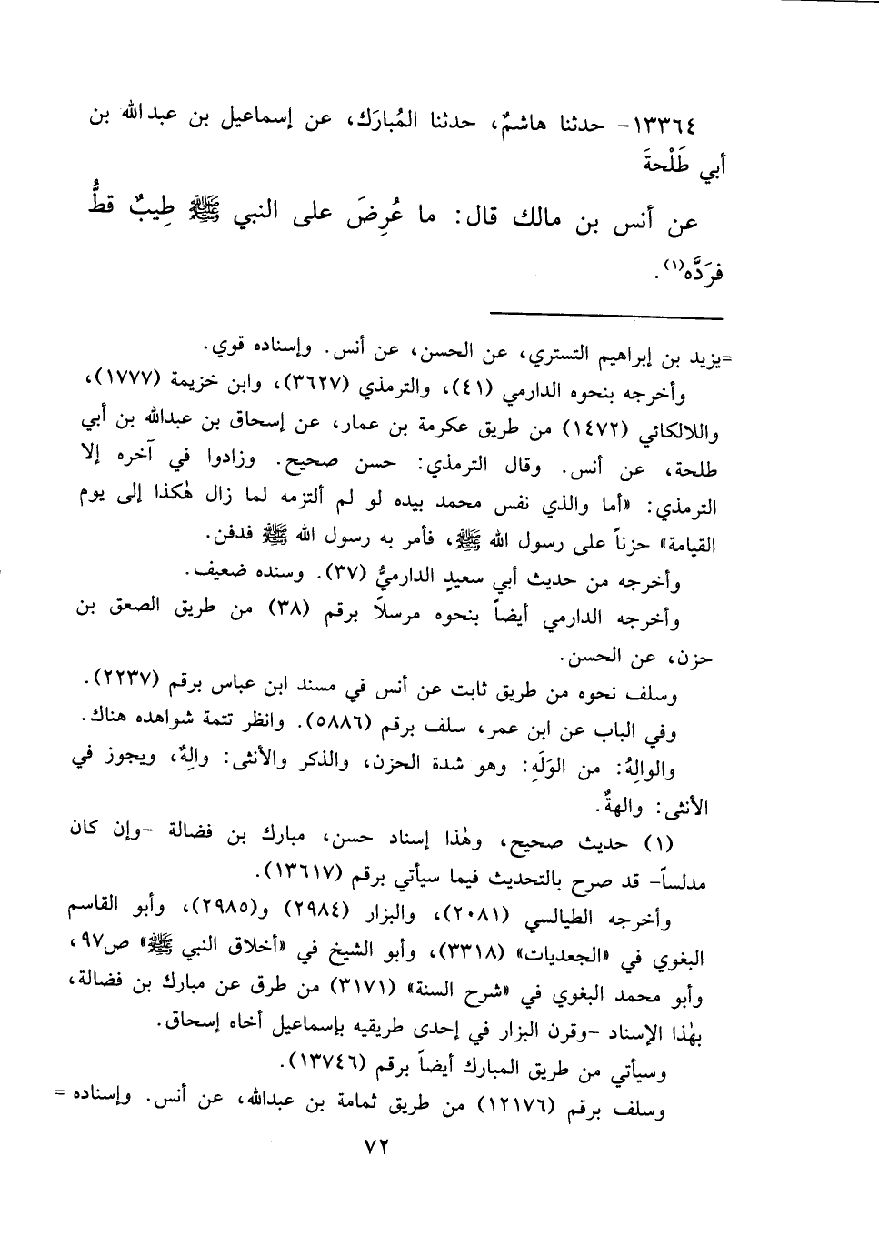 ١٣٣٦٤ - حَدَّثَنَا هَاشِمٌ، حَدَّثَنَا الْمُبَارَكُ، عَنْ إِسْمَاعِيلَ بْنِ عَبْدِ اللهِ بْنِ أَبِى طَلْحَةَ، عَنْ أَنَسِ بْنِ مَالِكٍ قَالَ: " مَا عُرِضَ عَلَى النَّبِيِّ صَلَّى اللهُ عَلَيْهِ وَسَلَّمَ طِيبٌ قَطُّ فَرَدَّهُ " (١)
