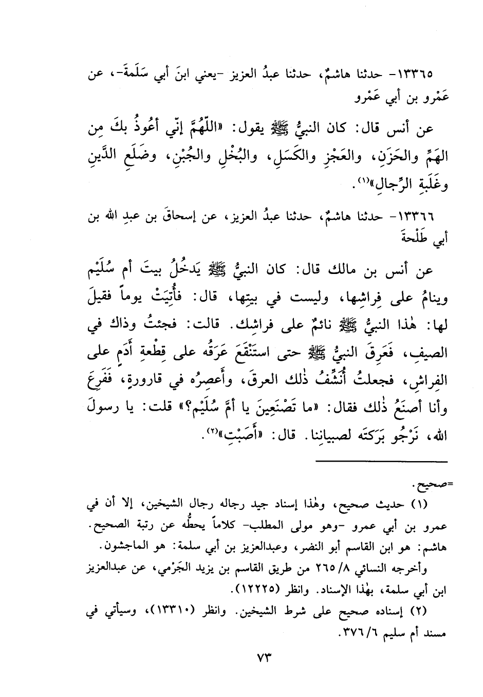 ١٣٣٦٦ - حَدَّثَنَا هَاشِمٌ، حَدَّثَنَا عَبْدُ الْعَزِيزِ، عَنْ إِسْحَاقَ بْنِ عَبْدِ اللهِ بْنِ أَبِي طَلْحَةَ، عَنْ أَنَسِ بْنِ مَالِكٍ قَالَ: كَانَ النَّبِيُّ صَلَّى اللهُ عَلَيْهِ وَسَلَّمَ يَدْخُلُ بَيْتَ أُمِّ سُلَيْمٍ وَيَنَامُ عَلَى فِرَاشِهَا، وَلَيْسَتْ فِي بَيْتِهَا، قَالَ: فَأُتِيَتْ يَوْمًا، فَقِيلَ لَهَا: هَذَا النَّبِيُّ صَلَّى اللهُ عَلَيْهِ وَسَلَّمَ نَائِمٌ عَلَى فِرَاشِكِ، قَالَتْ: فَجِئْتُ وَذَاكَ فِي الصَّيْفِ، فَعَرِقَ النَّبِيُّ صَلَّى اللهُ عَلَيْهِ وَسَلَّمَ حَتَّى اسْتَنْقَعَ عَرَقُهُ عَلَى قِطْعَةِ أَدَمٍ عَلَى الْفِرَاشِ فَجَعَلْتُ أُنَشِّفُ ذَلِكَ الْعَرَقَ، وَأَعْصِرُهُ فِي قَارُورَةٍ، فَفَزِعَ وَأَنَا أَصْنَعُ ذَلِكَ، فَقَالَ: " مَا تَصْنَعِينَ يَا أُمَّ سُلَيْمٍ؟ " قُلْتُ: يَا رَسُولَ اللهِ، نَرْجُو بَرَكَتَهُ لِصِبْيَانِنَا، قَالَ: " أَصَبْتِ " (٢)