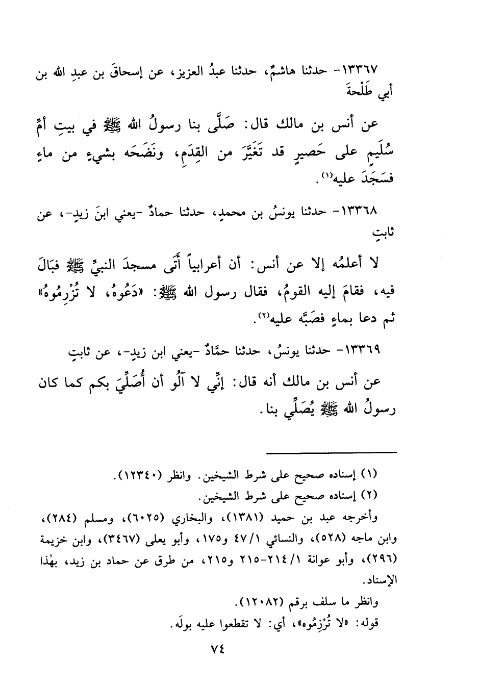 ١٣٣٦٨ - حَدَّثَنَا يُونُسُ بْنُ مُحَمَّدٍ، حَدَّثَنَا حَمَّادٌ يَعْنِي ابْنَ زَيْدٍ، عَنْ ثَابِتٍ، لَا أَعْلَمُهُ إِلَّا عَنْ أَنَسٍ، أَنَّ أَعْرَابِيًّا أَتَى مَسْجِدَ النَّبِيِّ صَلَّى اللهُ عَلَيْهِ وَسَلَّمَ، فَبَالَ فِيهِ، فَقَامَ إِلَيْهِ الْقَوْمُ، فَقَالَ رَسُولُ اللهِ صَلَّى اللهُ عَلَيْهِ وَسَلَّمَ: " دَعُوهُ لَا تُزْرِمُوهُ "، ثُمَّ دَعَا بِمَاءٍ، فَصَبَّهُ عَلَيْهِ (٢)