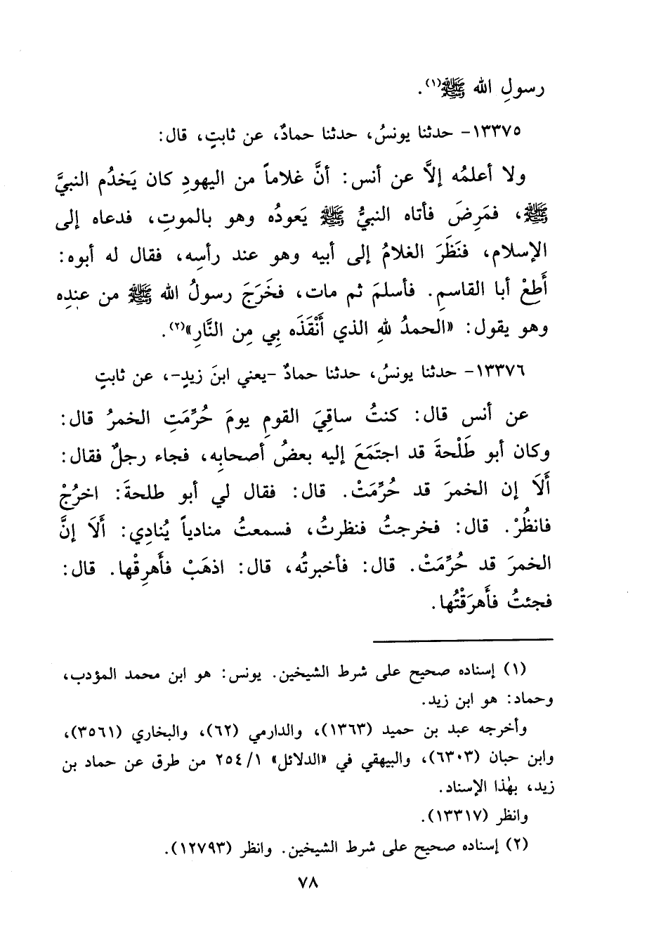 ١٣٣٧٥ - حَدَّثَنَا يُونُسُ، حَدَّثَنَا حَمَّادٌ، عَنْ ثَابِتٍ، قَالَ: وَلَا أَعْلَمُهُ إِلَّا عَنْ أَنَسٍ، أَنَّ غُلَامًا مِنَ الْيَهُودِ كَانَ يَخْدُمُ النَّبِيَّ صَلَّى اللهُ عَلَيْهِ وَسَلَّمَ، فَمَرِضَ فَأَتَاهُ النَّبِيُّ صَلَّى اللهُ عَلَيْهِ وَسَلَّمَ يَعُودُهُ وَهُوَ بِالْمَوْتِ، فَدَعَاهُ إِلَى الْإِسْلَامِ، فَنَظَرَ الْغُلَامُ إِلَى أَبِيهِ وَهُوَ عِنْدَ رَأْسِهِ، فَقَالَ لَهُ أَبُوهُ: أَطِعْ أَبَا الْقَاسِمِ، فَأَسْلَمَ، ثُمَّ مَاتَ، فَخَرَجَ رَسُولُ اللهِ صَلَّى اللهُ عَلَيْهِ وَسَلَّمَ مِنْ عِنْدِهِ وَهُوَ يَقُولُ: " الْحَمْدُ لِلَّهِ الَّذِي أَنْقَذَهُ بِي مِنَ النَّارِ " (٢)