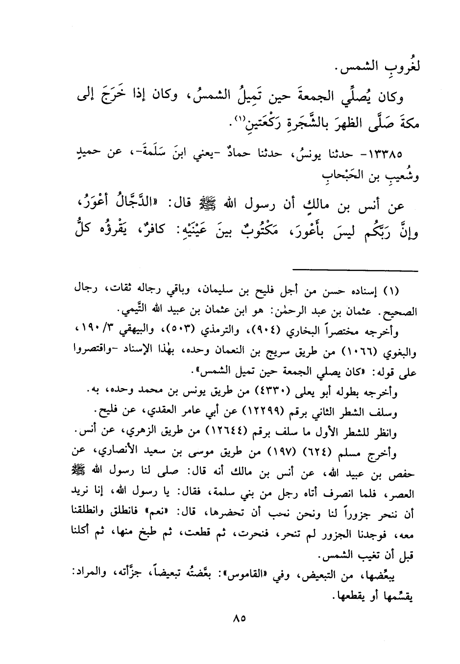 وأخرجه مختصراً البخاري (٩٠٤) ، والترمذي (٥٠٣) ، والبيهقي ٣/١٩٠، والبغوي (١٠٦٦) من طريق سريج بن النعمان وحده، بهذا الإسناد- واقتصروا على قوله: "كان يصلي الجمعة حين تميل الشمس ".