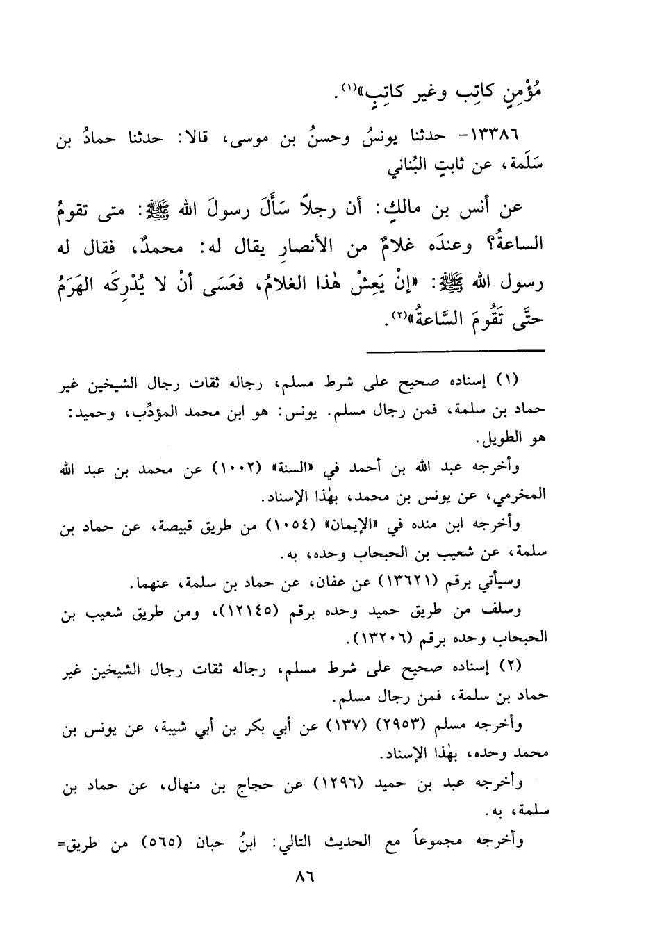 ١٣٣٨٦ - حَدَّثَنَا يُونُسُ، وَحَسَنُ بْنُ مُوسَى، قَالَا: حَدَّثَنَا حَمَّادُ بْنُ سَلَمَةَ، عَنْ ثَابِتٍ الْبُنَانِيِّ، عَنْ أَنَسِ بْنِ مَالِكٍ، أَنَّ رَجُلًا سَأَلَ رَسُولَ اللهِ صَلَّى اللهُ عَلَيْهِ وَسَلَّمَ: مَتَى تَقُومُ السَّاعَةُ؟ وَعِنْدَهُ غُلَامٌ مِنَ الْأَنْصَارِ يُقَالُ لَهُ: مُحَمَّدٌ، فَقَالَ لَهُ رَسُولُ اللهِ صَلَّى اللهُ عَلَيْهِ وَسَلَّمَ: " إِنْ يَعِشْ هَذَا الْغُلَامُ فَعَسَى أَنْ لَا يُدْرِكَهُ الْهَرَمُ حَتَّى تَقُومَ السَّاعَةُ " (٢)