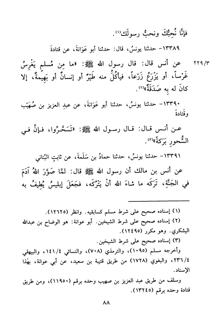 ١٣٣٨٩ - حَدَّثَنَا يُونُسُ، قَالَ: حَدَّثَنَا أَبُو عَوَانَةَ، عَنْ قَتَادَةَ، عَنْ أَنَسٍ قَالَ: قَالَ رَسُولُ اللهِ صَلَّى اللهُ عَلَيْهِ وَسَلَّمَ: " مَا مِنْ مُسْلِمٍ يَغْرِسُ غَرْسًا، أَوْ يَزْرَعُ زَرْعًا، فَيَأْكُلُ مِنْهُ طَيْرٌ أَوْ إِنْسَانٌ أَوْ بَهِيمَةٌ، إِلَّا كَانَ لَهُ بِهِ صَدَقَةٌ " (٢)