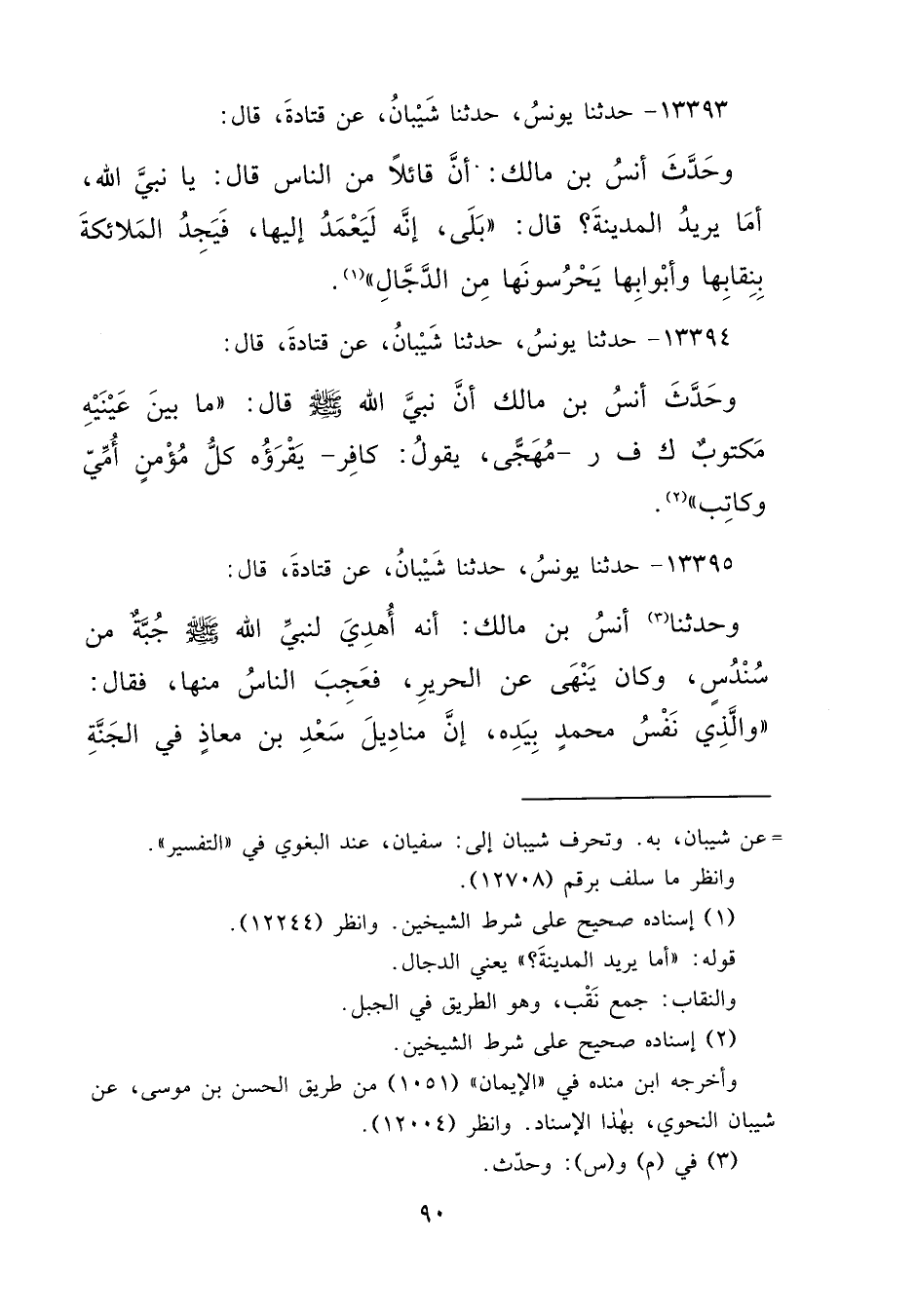 ١٣٣٩٤ - حَدَّثَنَا يُونُسُ، حَدَّثَنَا شَيْبَانُ، عَنْ قَتَادَةَ، قَالَ: وَحَدَّثَ أَنَسُ بْنُ مَالِكٍ، أَنَّ نَبِيَّ اللهِ صَلَّى اللهُ عَلَيْهِ وَسَلَّمَ قَالَ: " مَا بَيْنَ عَيْنَيْهِ مَكْتُوبٌ: ك ف ر - مُهَجًّى، يَقُولُ: كَافِرٌ - يَقْرَؤُهُ كُلُّ مُؤْمِنٍ أُمِّيٌّ وَكَاتِبٌ " (٢)