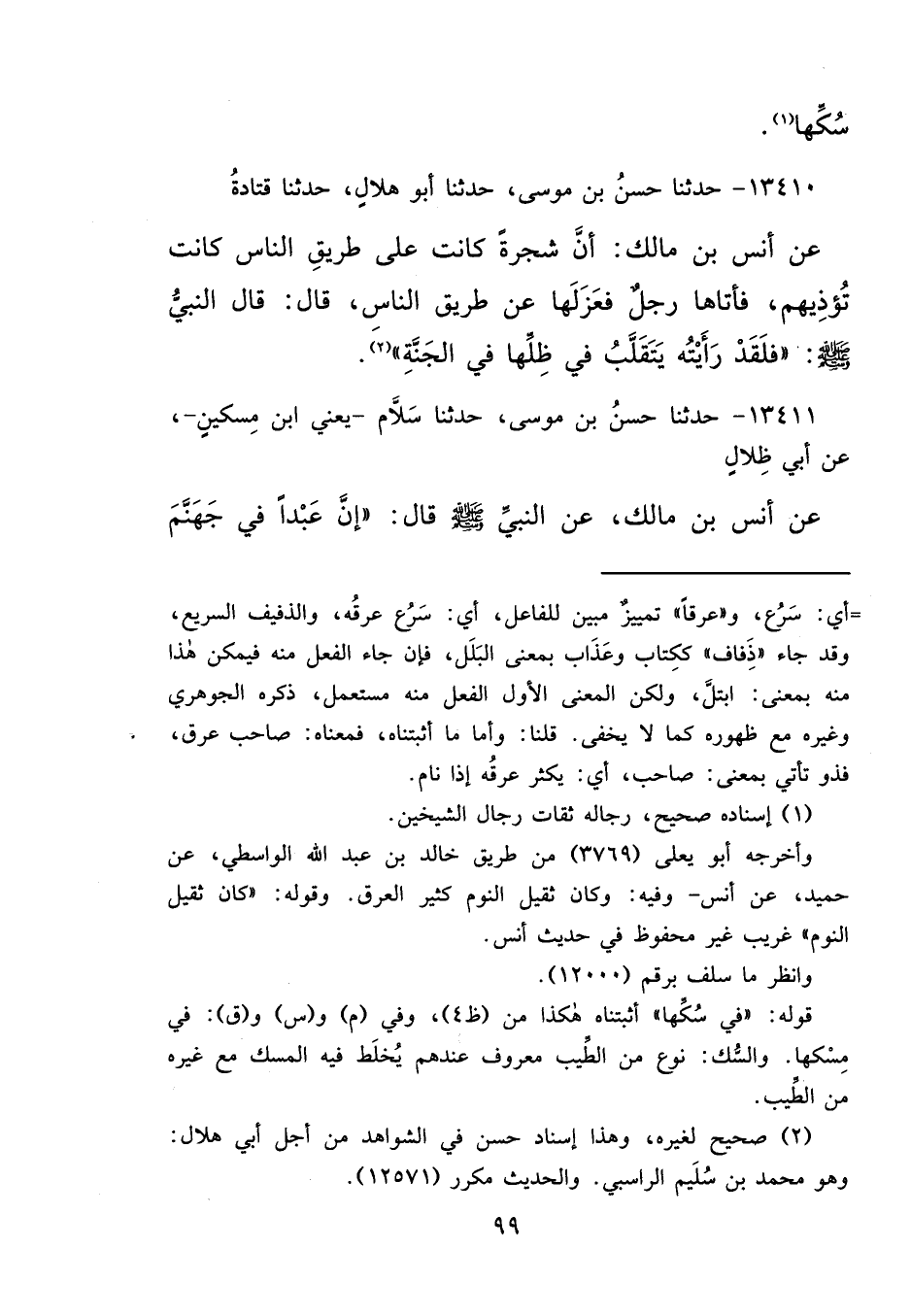 ١٣٤١٠ - حَدَّثَنَا حَسَنُ بْنُ مُوسَى، حَدَّثَنَا أَبُو هِلَالٍ، حَدَّثَنَا قَتَادَةُ، عَنْ أَنَسِ بْنِ مَالِكٍ، أَنَّ شَجَرَةً كَانَتْ عَلَى طَرِيقِ النَّاسِ كَانَتْ تُؤْذِيهِمْ، فَأَتَاهَا رَجُلٌ فَعَزَلَهَا عَنْ طَرِيقِ النَّاسِ، قَالَ: قَالَ النَّبِيُّ صَلَّى اللهُ عَلَيْهِ وَسَلَّمَ: " فَلَقَدْ رَأَيْتُهُ يَتَقَلَّبُ فِي ظِلِّهَا فِي الْجَنَّةِ " (٢)