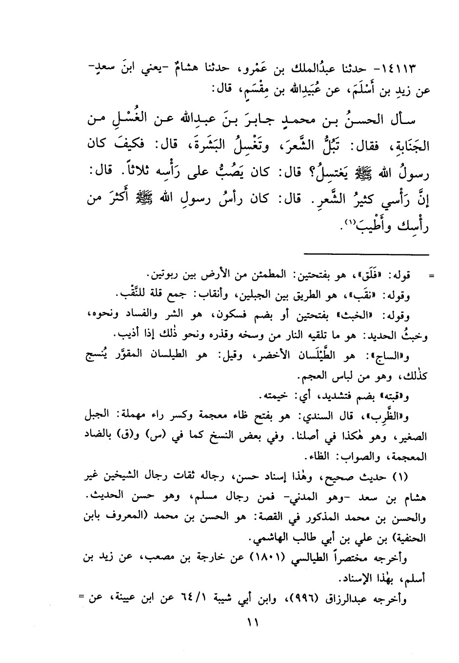١٤١١٣ - حَدَّثَنَا عَبْدُ الْمَلِكِ بْنُ عَمْرٍو، حَدَّثَنَا هِشَامٌ يَعْنِي ابْنَ سَعْدٍ، عَنْ زَيْدِ بْنِ أَسْلَمَ، عَنْ عُبَيْدِ اللهِ بْنِ مِقْسَمٍ، قَالَ: سَأَلَ الْحَسَنُ بْنُ مُحَمَّدٍ، جَابِرَ بْنَ عَبْدِ اللهِ، عَنِ الْغُسْلِ مِنَ الْجَنَابَةِ، فَقَالَ: " تَبُلُّ الشَّعْرَ، وَتَغْسِلُ الْبَشَرَةَ "، قَالَ: فَكَيْفَ كَانَ رَسُولُ اللهِ صَلَّى اللهُ عَلَيْهِ وَسَلَّمَ يَغْتَسِلُ؟ قَالَ: " كَانَ يَصُبُّ عَلَى رَأْسِهِ ثَلَاثًا "، قَالَ: إِنَّ رَأْسِي كَثِيرُ الشَّعْرِ، قَالَ: " كَانَ رَأْسُ رَسُولِ اللهِ صَلَّى اللهُ عَلَيْهِ وَسَلَّمَ أَكْثَرَ مِنْ رَأْسِكَ، وَأَطْيَبَ " (١)