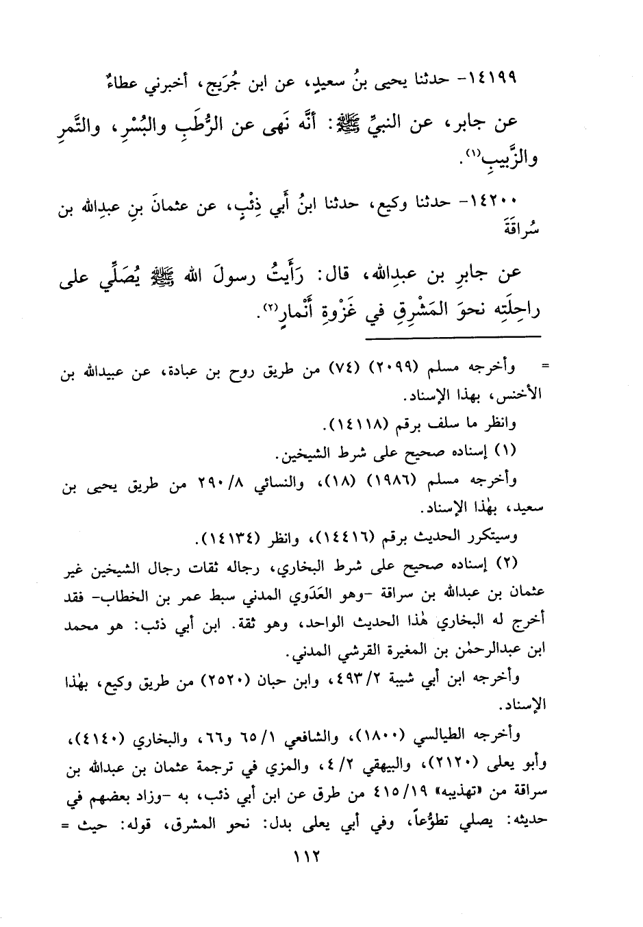 ١٤٢٠٠ - حَدَّثَنَا وَكِيعٌ، حَدَّثَنَا ابْنُ أَبِي ذِئْبٍ، عَنْ عُثْمَانَ بْنِ عَبْدِ اللهِ بْنِ سُرَاقَةَ، عَنْ جَابِرِ بْنِ عَبْدِ اللهِ، قَالَ: " رَأَيْتُ رَسُولَ اللهِ صَلَّى اللهُ عَلَيْهِ وَسَلَّمَ يُصَلِّي عَلَى رَاحِلَتِهِ نَحْوَ الْمَشْرِقِ فِي غَزْوَةِ أَنْمَارٍ " (٢)