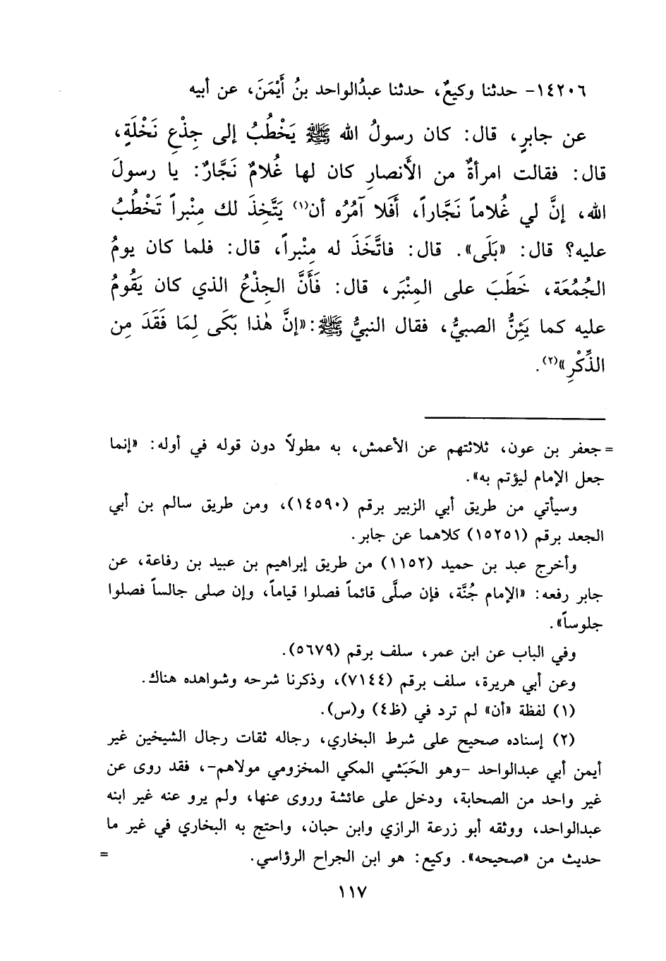 ١٤٢٠٦ - حَدَّثَنَا وَكِيعٌ، حَدَّثَنَا عَبْدُ الْوَاحِدِ بْنُ أَيْمَنَ، عَنْ أَبِيهِ، عَنْ جَابِرٍ، قَالَ: كَانَ رَسُولُ اللهِ صَلَّى اللهُ عَلَيْهِ وَسَلَّمَ يَخْطُبُ إِلَى جِذْعِ نَخْلَةٍ، قَالَ: فَقَالَتْ امْرَأَةٌ مِنَ الْأَنْصَارِ كَانَ لَهَا غُلَامٌ نَجَّارٌ: يَا رَسُولَ اللهِ، إِنَّ لِي غُلَامًا نَجَّارًا، أَفَلَا آمُرُهُ أَنْ (١) يَتَّخِذَ لَكَ مِنْبَرًا تَخْطُبُ عَلَيْهِ؟ قَالَ: " بَلَى "، قَالَ: فَاتَّخَذَ لَهُ مِنْبَرًا، قَالَ: فَلَمَّا كَانَ يَوْمُ الْجُمُعَةِ خَطَبَ عَلَى الْمِنْبَرِ، قَالَ: فَأَنَّ الْجِذْعُ الَّذِي كَانَ يَقُومُ عَلَيْهِ كَمَا يَئِنُّ الصَّبِيُّ، فَقَالَ النَّبِيُّ صَلَّى اللهُ عَلَيْهِ وَسَلَّمَ: " إِنَّ هَذَا بَكَى لِمَا فَقَدَ مِنَ الذِّكْرِ " (٢)