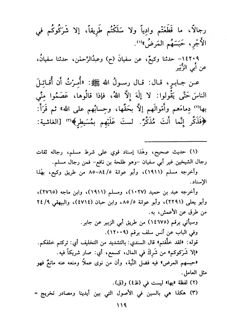 ١٤٢٠٩ - حَدَّثَنَا وَكِيعٌ، عَنْ سُفْيَانَ، ح وَعَبْدُ الرَّحْمَنِ، حَدَّثَنَا سُفْيَانُ، عَنْ أَبِي الزُّبَيْرِ، عَنْ جَابِرٍ، قَالَ: قَالَ رَسُولُ اللهِ صَلَّى اللهُ عَلَيْهِ وَسَلَّمَ: " أُمِرْتُ أَنْ أُقَاتِلَ النَّاسَ حَتَّى يَقُولُوا: لَا إِلَهَ إِلَّا اللهُ، فَإِذَا قَالُوهَا، عَصَمُوا مِنِّي بِهَا (٢) دِمَاءَهُمْ وَأَمْوَالَهُمْ، إِلَّا بِحَقِّهَا، وَحِسَابُهُمْ عَلَى اللهِ "، ثُمَّ قَرَأَ فَذَكِّرْ: {إِنَّمَا أَنْتَ مُذَّكِرٌ لَسْتَ عَلَيْهِمْ بِمُسَيْطِرٍ (٣) } الغاشية