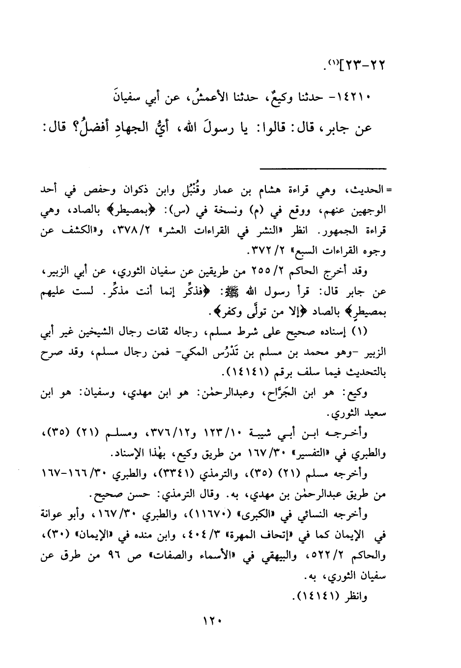١٤٢١٠ - حَدَّثَنَا وَكِيعٌ، حَدَّثَنَا الْأَعْمَشُ، عَنْ أَبِي سُفْيَانَ، عَنْ جَابِرٍ، قَالَ: قَالُوا: يَا رَسُولَ اللهِ، أَيُّ الْجِهَادِ أَفْضَلُ؟ قَالَ: "
